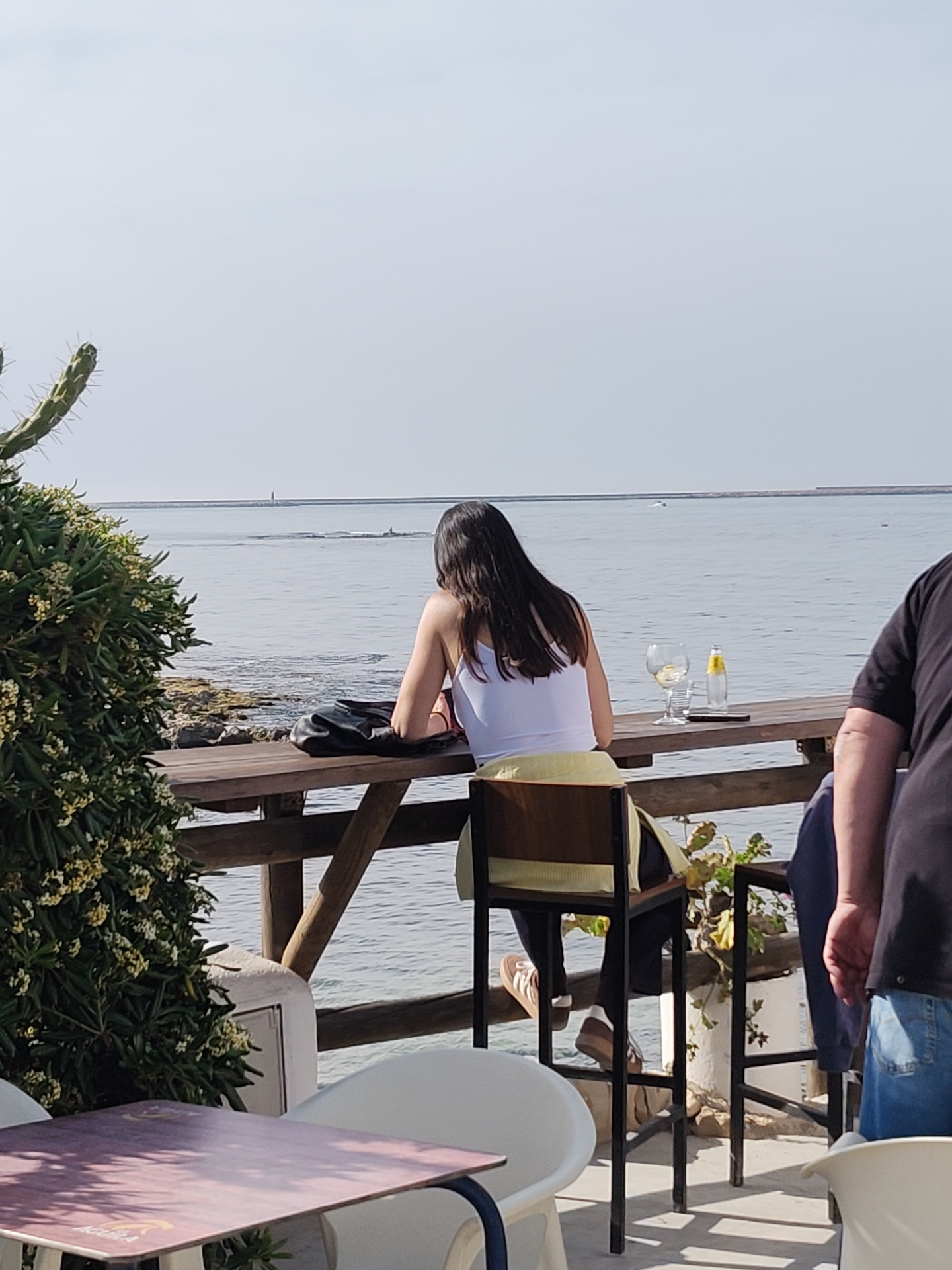 A medium shot captures a woman with long, dark hair sitting at a wooden table with a view of the sea in Dénia, Spain. She wears a white tank top and is positioned with her back to the viewer. On the table beside her are a glass containing a drink and a bottle. A black purse rests next to her. The table is part of a wooden railing structure overlooking the water. To the left of the scene, a cactus-like bush with white flowers partially obscures the view. In the foreground, a table with a maroon and white top is surrounded by white plastic chairs. To the right, a man in a black t-shirt and jeans is partially visible. The sea stretches out in front of the scene towards the horizon under a clear sky. A breakwater or pier is visible in the distance. | Open Wire