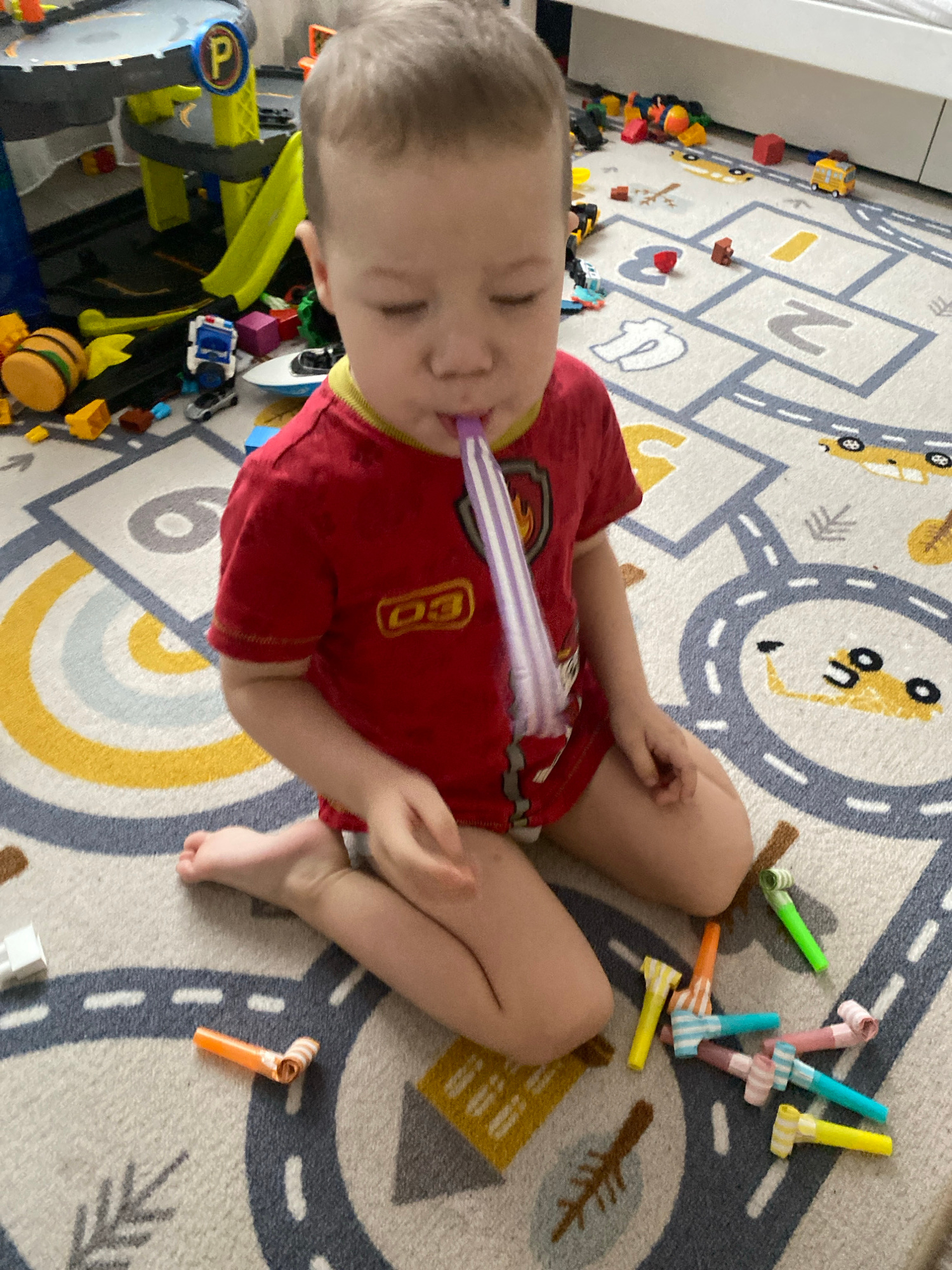 This image captures a young child sitting on a themed rug in what is identified as Sochi, Russia. The child, with light hair, is wearing a red short-sleeved shirt with a yellow emblem on the front and…read more