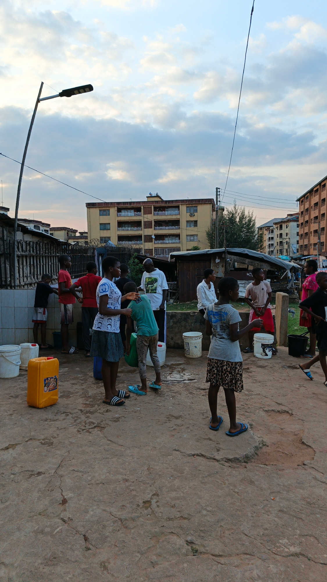This image captures a bustling outdoor scene in what appears to be a residential area, likely in Onitsha, Nigeria, given the context. The time of day seems to be late afternoon or early evening, indic…read more