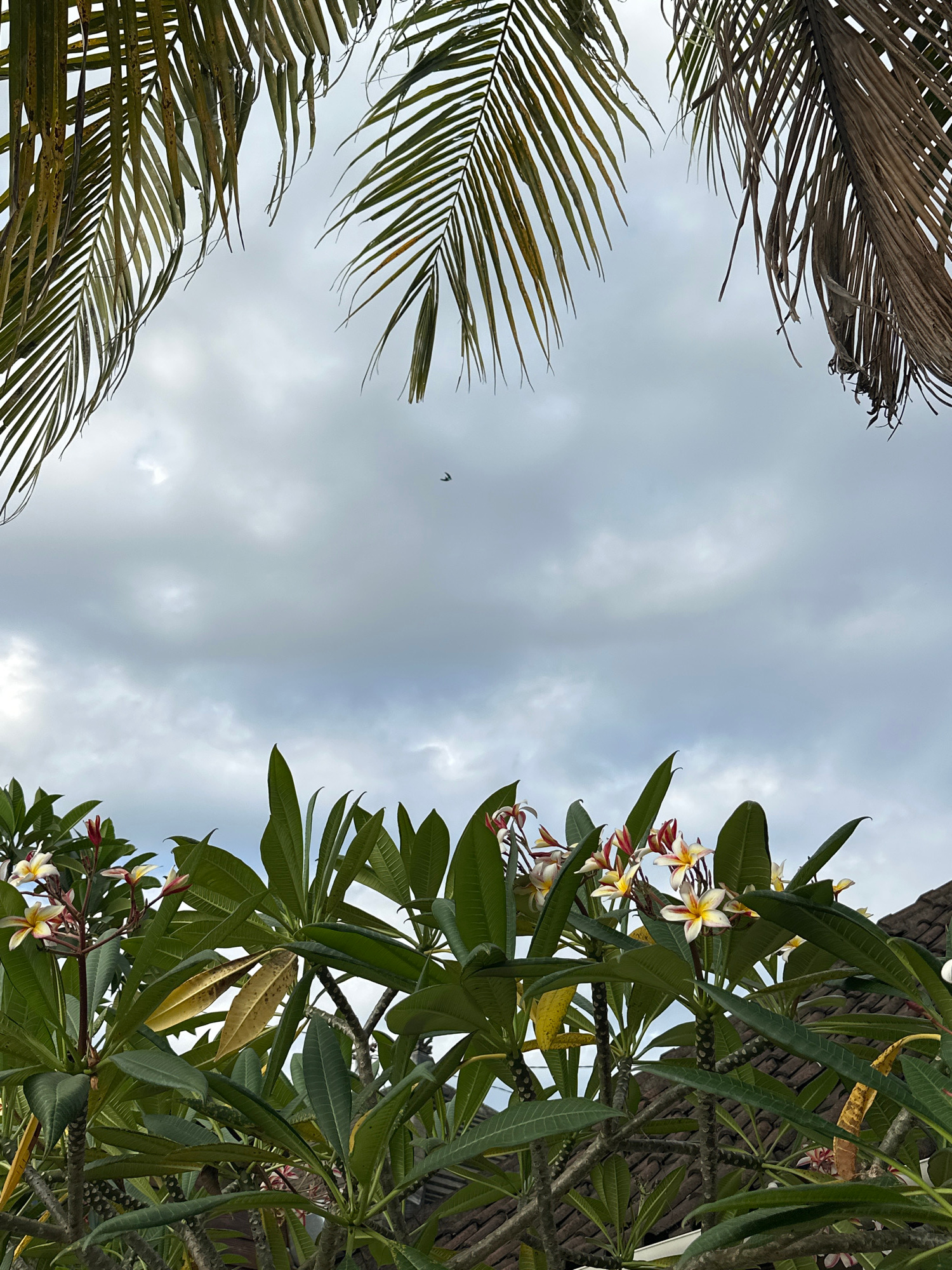The image depicts a view looking upwards towards a cloudy sky in North Kuta, Indonesia. The frame is partially bordered by the leaves of a palm tree on the left and a flowering plumeria tree on the ri…read more