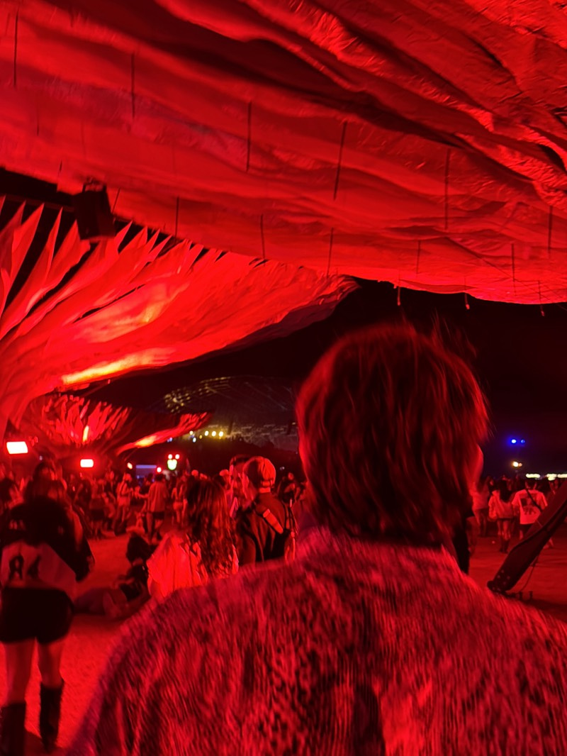 The image shows a crowd of people at an event in Indio, California. A red-toned, tent-like canopy covers the area. A person in a patterned shirt is in the foreground, with their back to the camera. Ot…read more