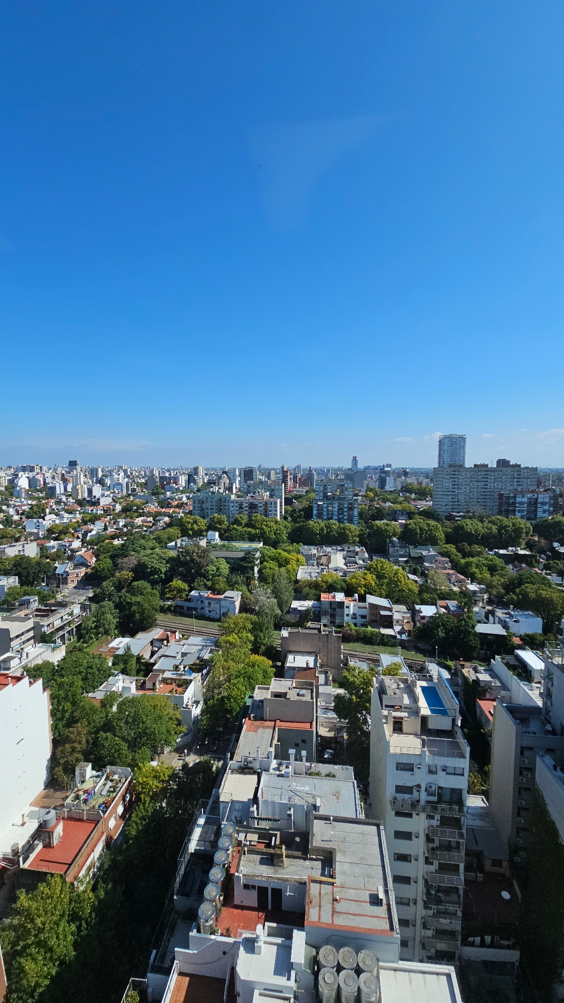 The image depicts a high-angle, sideways view of a portion of Buenos Aires, Argentina. On the right side of the image are dense clusters of buildings, with varying heights and architectural styles. So…read more