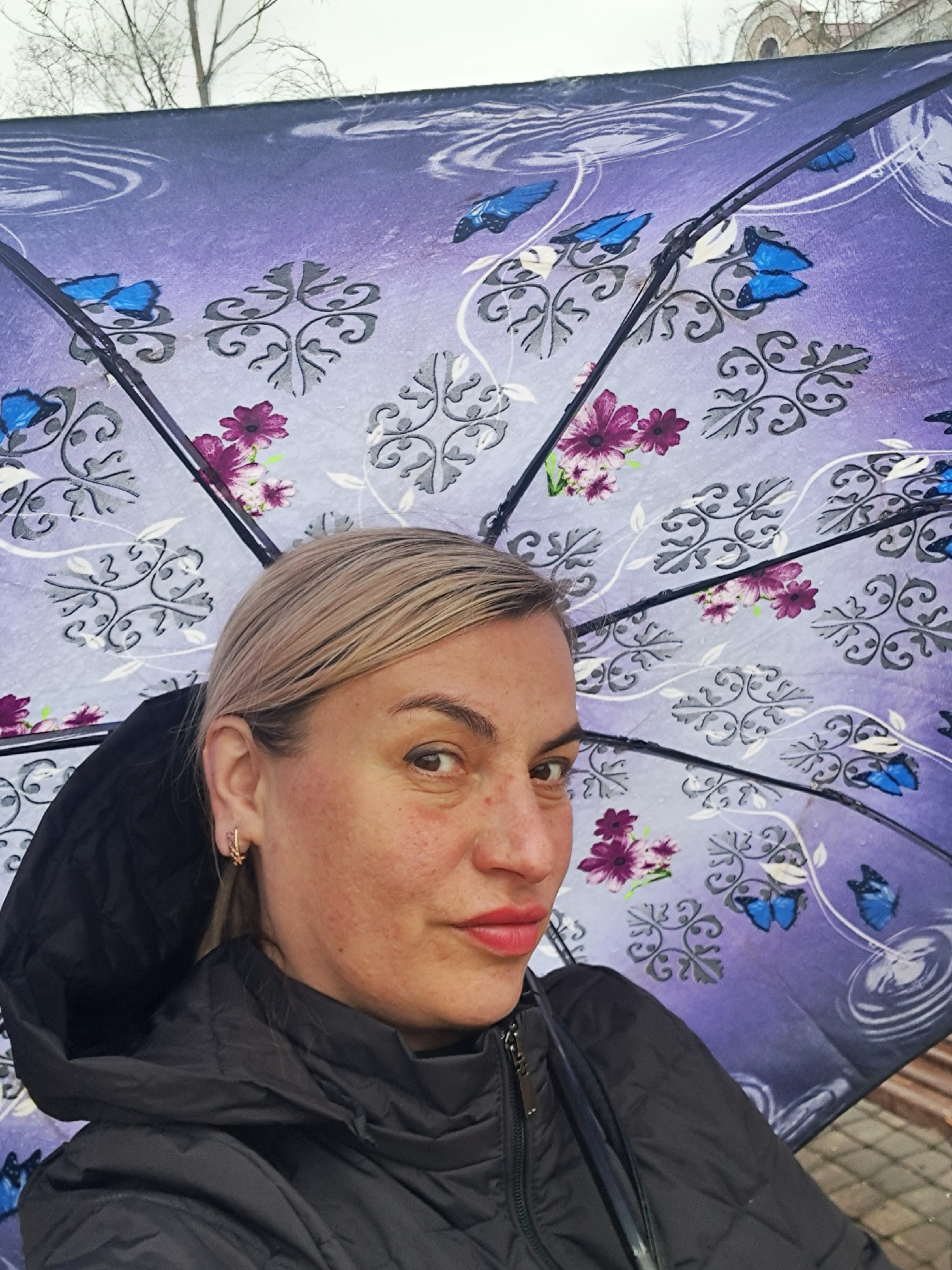A woman stands under a purple umbrella with a pattern of flowers, butterflies, and swirling designs. She is wearing a black hooded jacket. The background shows trees with bare branches and a possibly…read more