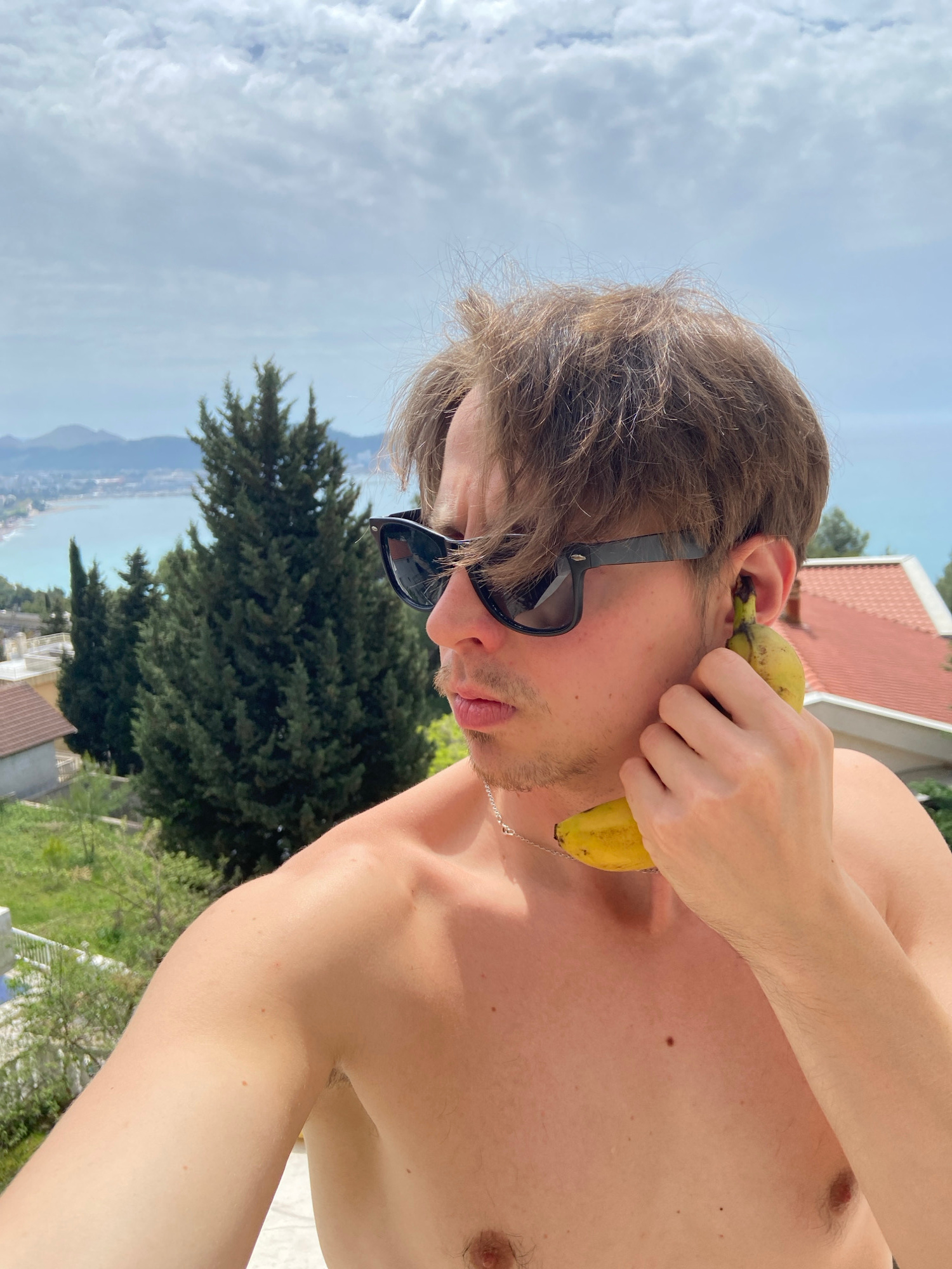 A shirtless man with sunglasses holds a banana to his ear. The background features a cloudy sky, a green tree, and a view of the coast with a body of water. In the far background, there are buildings…read more