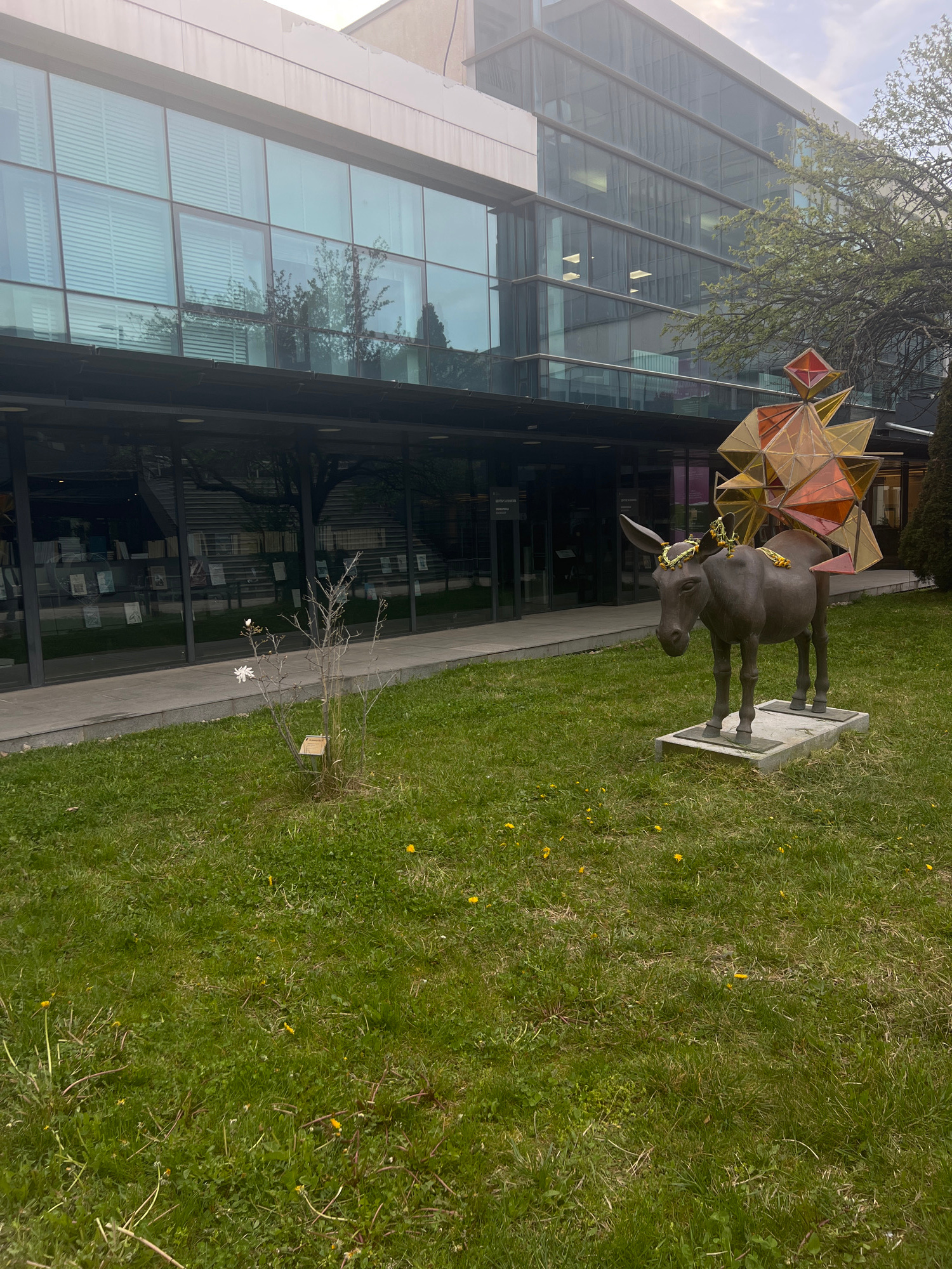 The image displays an outdoor scene in Sofia, Bulgaria, featuring a donkey sculpture positioned on a grassy lawn in front of a modern glass building. The time of day is bright daylight, suggesting cle…read more