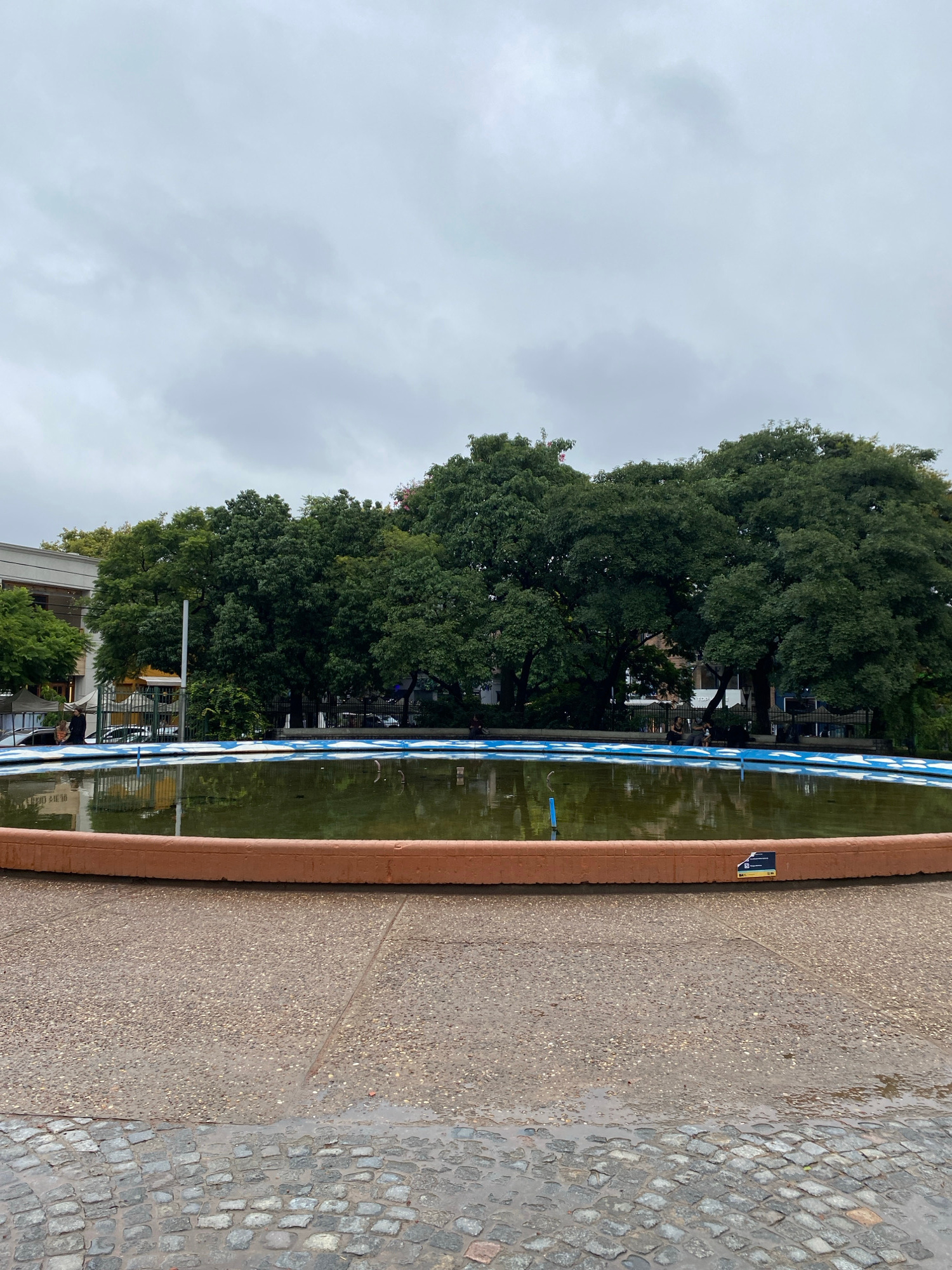 The image captures a scene at the Plaza Intendente Casares in Buenos Aires, Argentina. A long, rectangular fountain with a brown border and a blue and white patterned interior is in the center of theβ¦read more