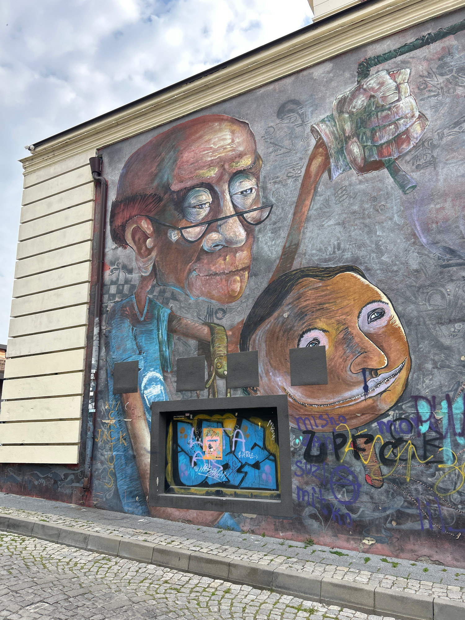 A mural is painted on the side of a building. The mural has two large human faces, one wearing glasses and the other holding a rope or cable in a gloved hand. A framed opening in the wall is filled wi…read more