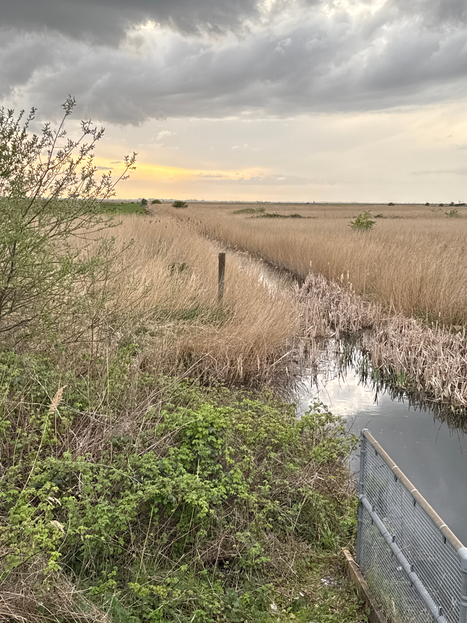 The image, originally rotated 90 degrees clockwise, displays a wide landscape scene typical of a marshland or coastal area near Gorleston-on-Sea. In the foreground, dense green bushes and tangled scr…read more