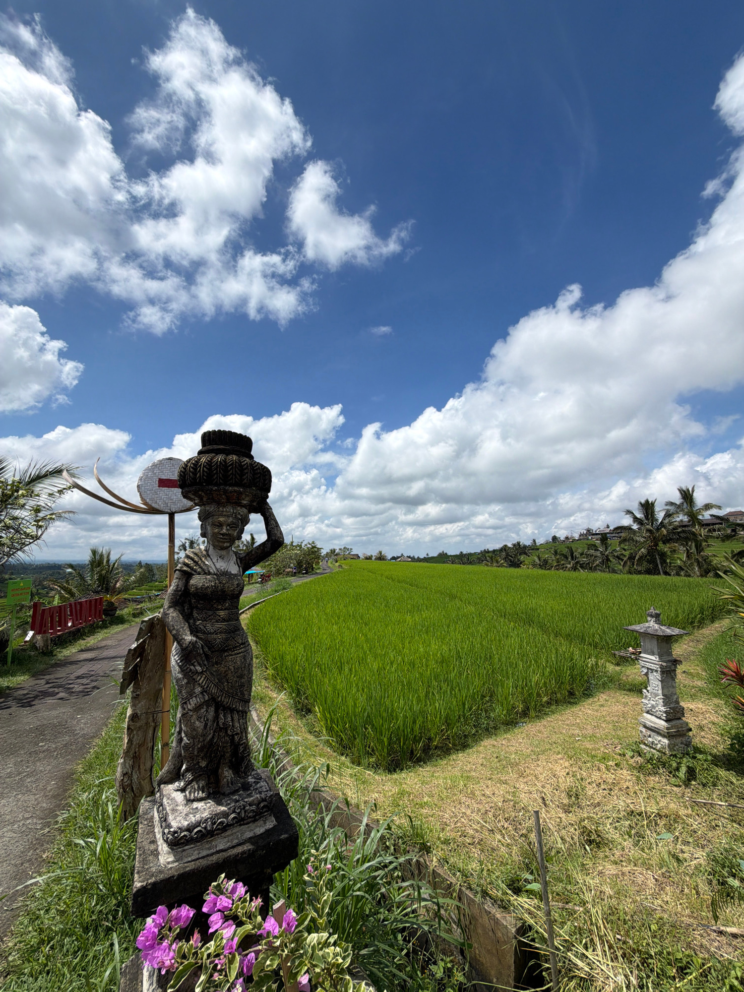 The image depicts a rice paddy landscape in an unknown location in Indonesia, taken on a clear day with a blue sky and scattered white clouds. A stone statue of a woman carrying what appears to be a s…read more