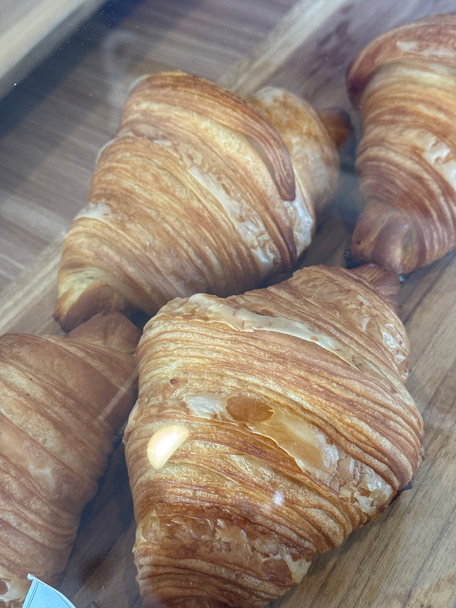The image displays a close-up view of several golden-brown croissants resting on a light wooden surface. The croissants, exhibiting a classic crescent shape with visible flaky layers, appear freshly b…read more