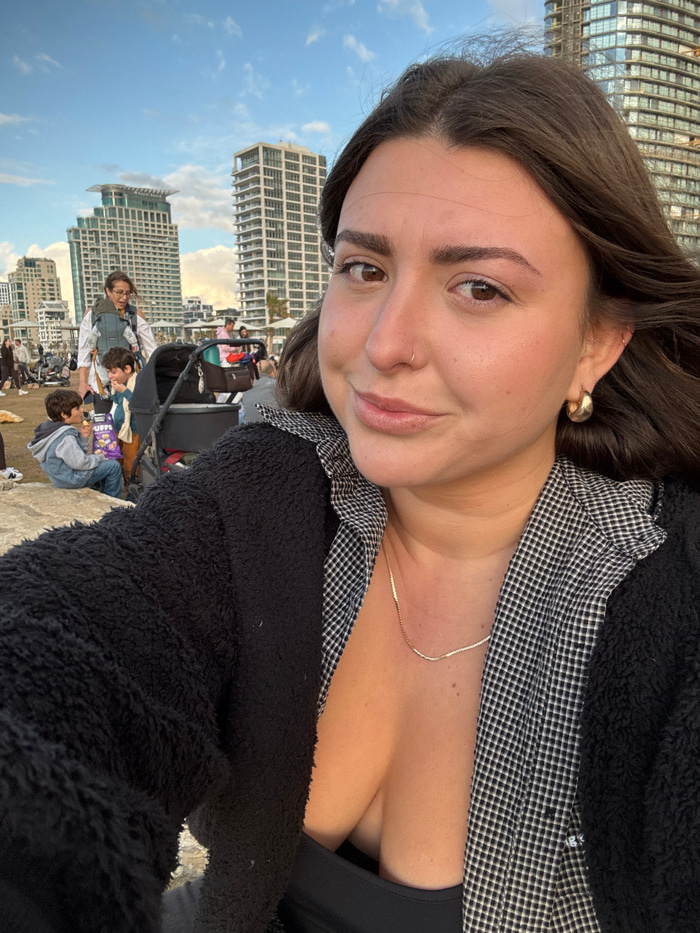 The image displays a female subject in a close-up selfie, positioned in the foreground. She has dark brown hair, a nose ring on her left nostril, and a gold hoop earring on her right ear. Her attire includes a black fleece jacket over an unbuttoned black and white plaid shirt, which reveals a black top and a gold chain necklace. She exhibits a slight smile. The background reveals an outdoor public space, likely a park or beachside area, consistent with the Tel-Aviv coastline in Israel. Prominent high-rise buildings are visible in the background, specifically the Royal Beach Hotel Tel Aviv with its distinctive roofline to the left. In the mid-ground, a woman wearing a light-colored top and a carrying harness is standing and observing two young boys seated on the ground. One boy, dressed in a grey hoodie and blue jeans, is holding a purple snack bag labeled "RUFFLES." The other boy, wearing a multi-colored jacket, sits adjacent to him. A dark-colored stroller is positioned between the adults and children. Additional individuals are scattered across the broader background. The sky is partly cloudy blue. | Open Wire