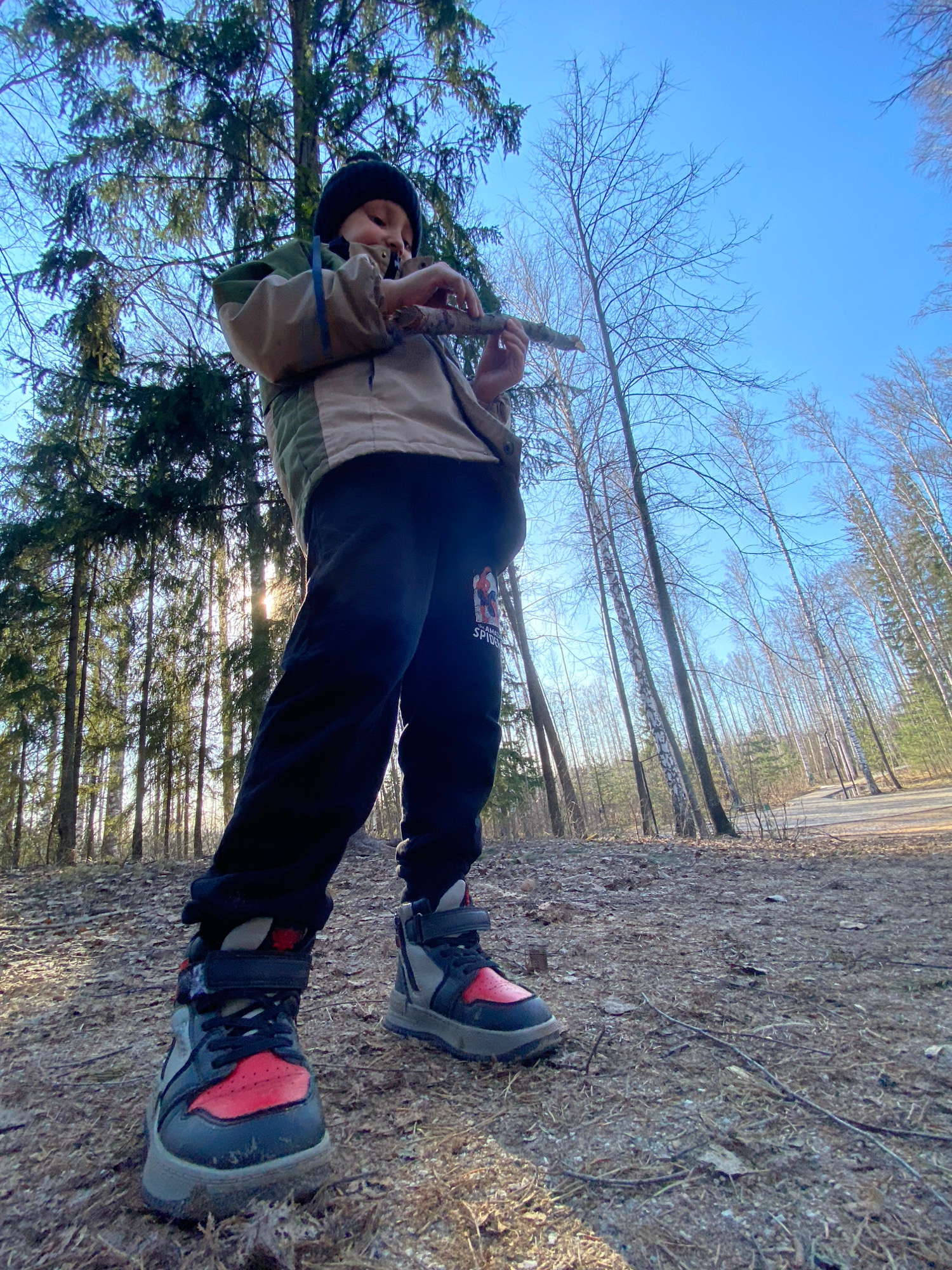 A person is standing in a forest, possibly in Noviy, Russia. The person is wearing a jacket, black pants with a red emblem on the leg, red and grey shoes, and a black hat. They are holding a stick. Th…read more