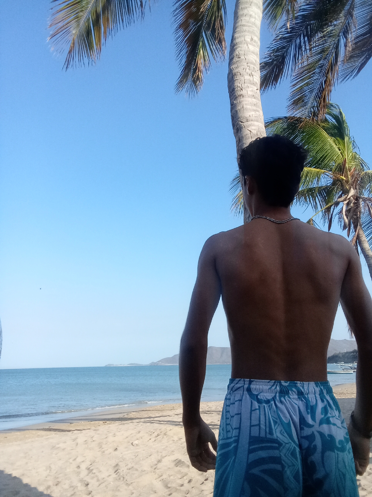 A man stands on a sandy beach, looking out toward the ocean in Juan Griego, Venezuela. The water is calm and a mountain can be seen in the distance. Palm trees are present around the man on the beach…read more