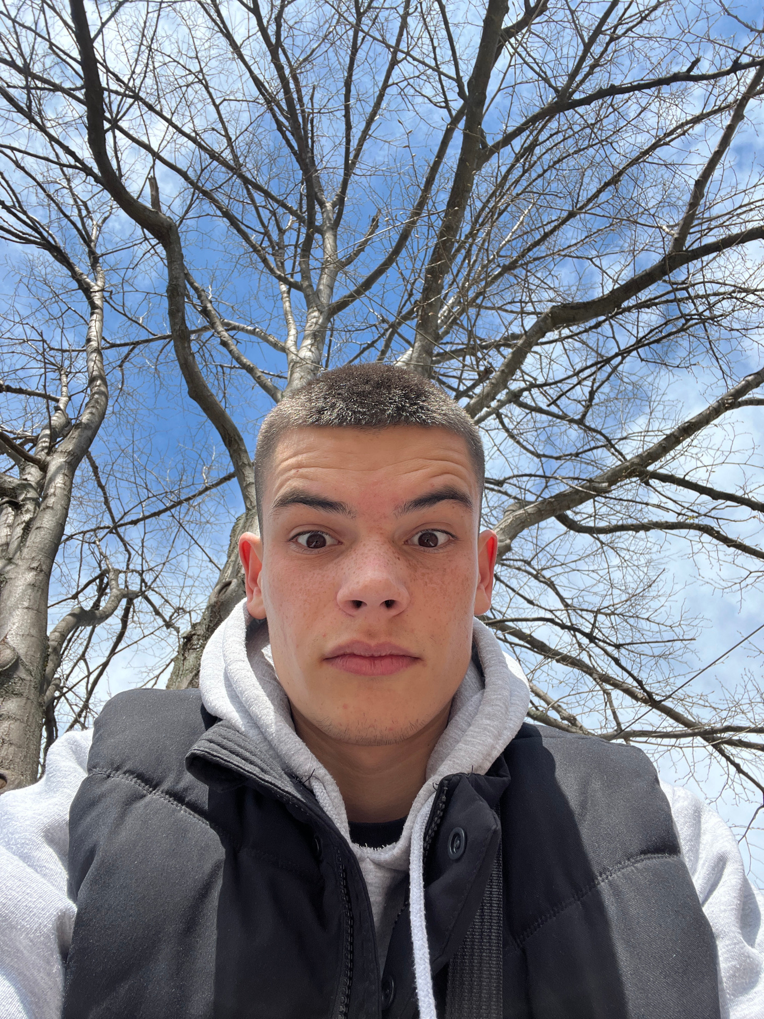A low-angle medium shot captures a young man against a backdrop of bare tree branches reaching towards a blue sky with scattered clouds. The man is positioned in the foreground, his face turned slight…read more