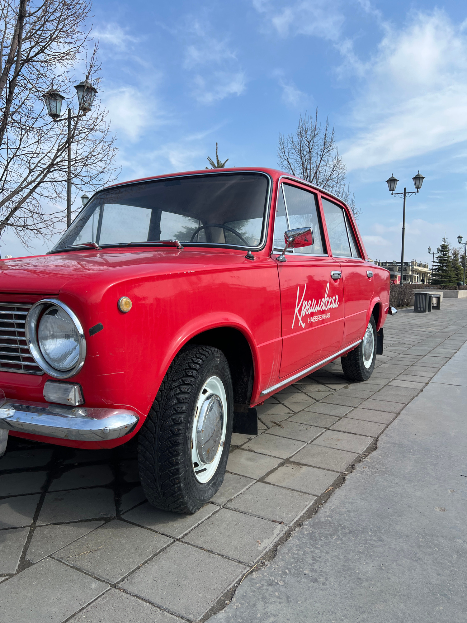 A red VAZ-2101 (Lada) is parked on a paved area. The car has white lettering on the side that reads "Кремлёвская набережная" in Russian. The car appears to be a promotional vehicle or display. Street…read more