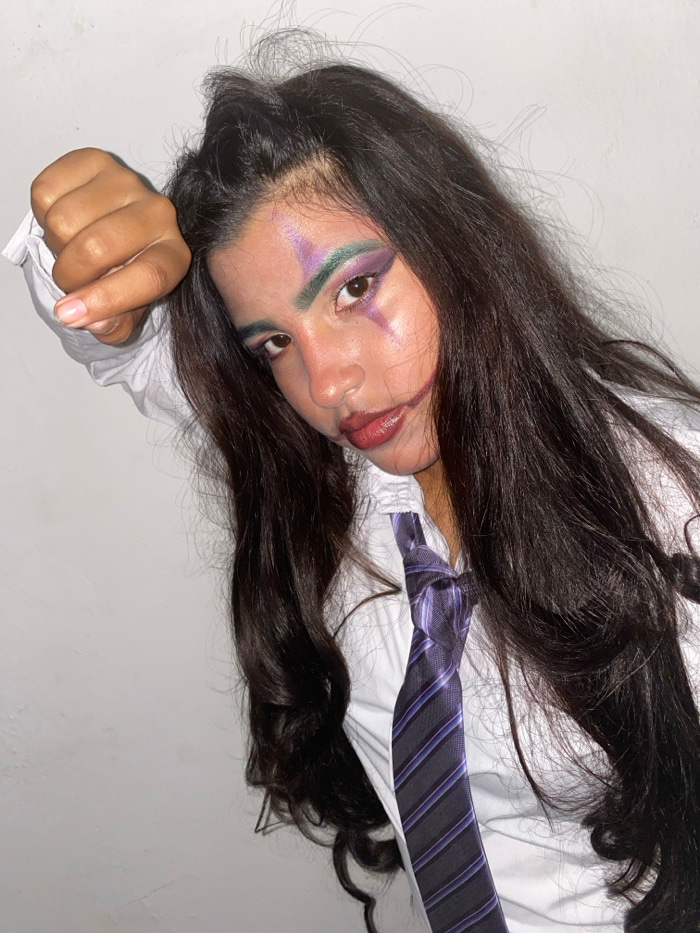 An individual with long, dark, wavy hair is depicted in a close-up, medium shot, rotated 90 degrees clockwise. The person is lying down against a plain, light-colored background, likely a wall or floo…read more