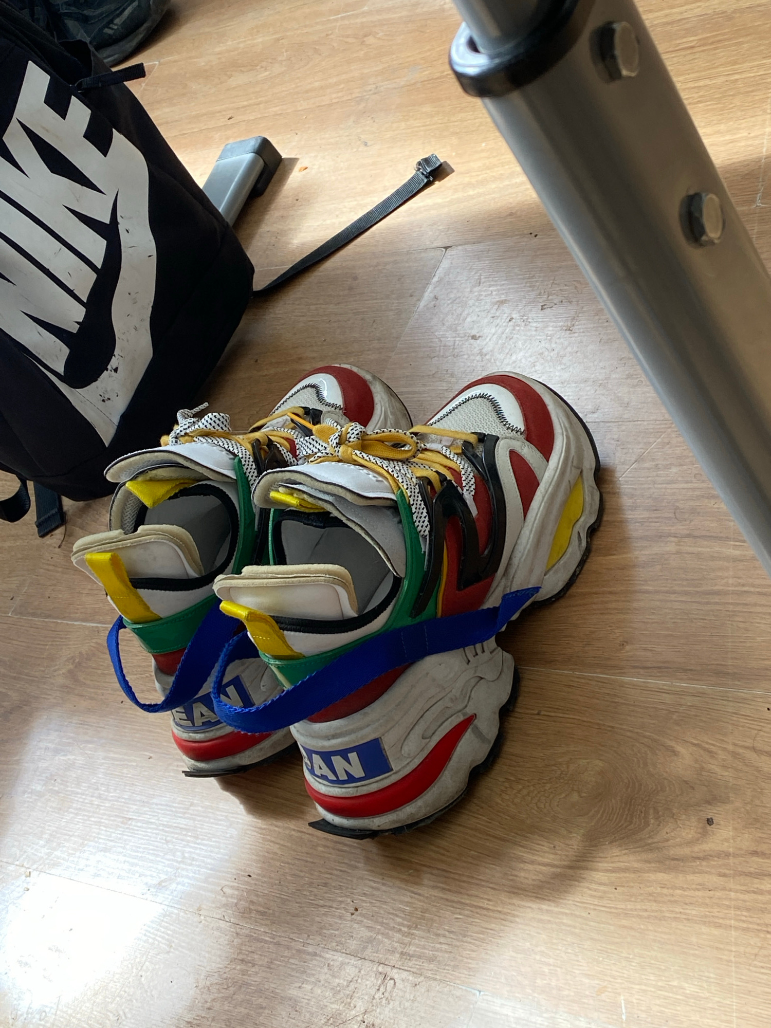 The image shows a pair of colorful sneakers stacked on top of each other on a wooden floor. A black backpack with a large white Nike logo is partially visible in the lower-left corner. A metal bar witβ¦read more