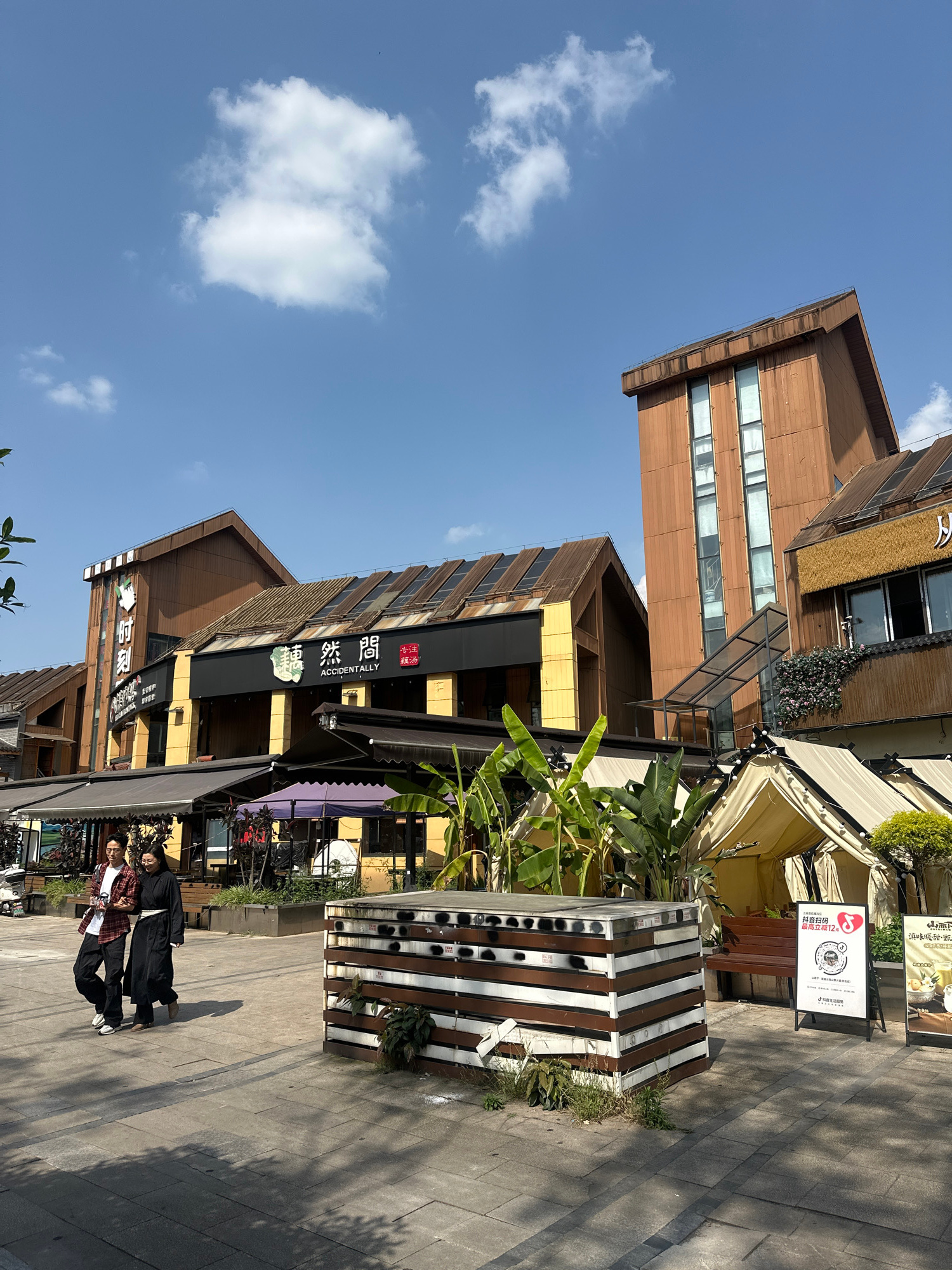This image captures a street scene in the Chongqing High-tech Zone, China, on a clear and sunny day. The perspective is slightly upward, showcasing the sky, buildings, and sidewalk. Two individuals a…read more