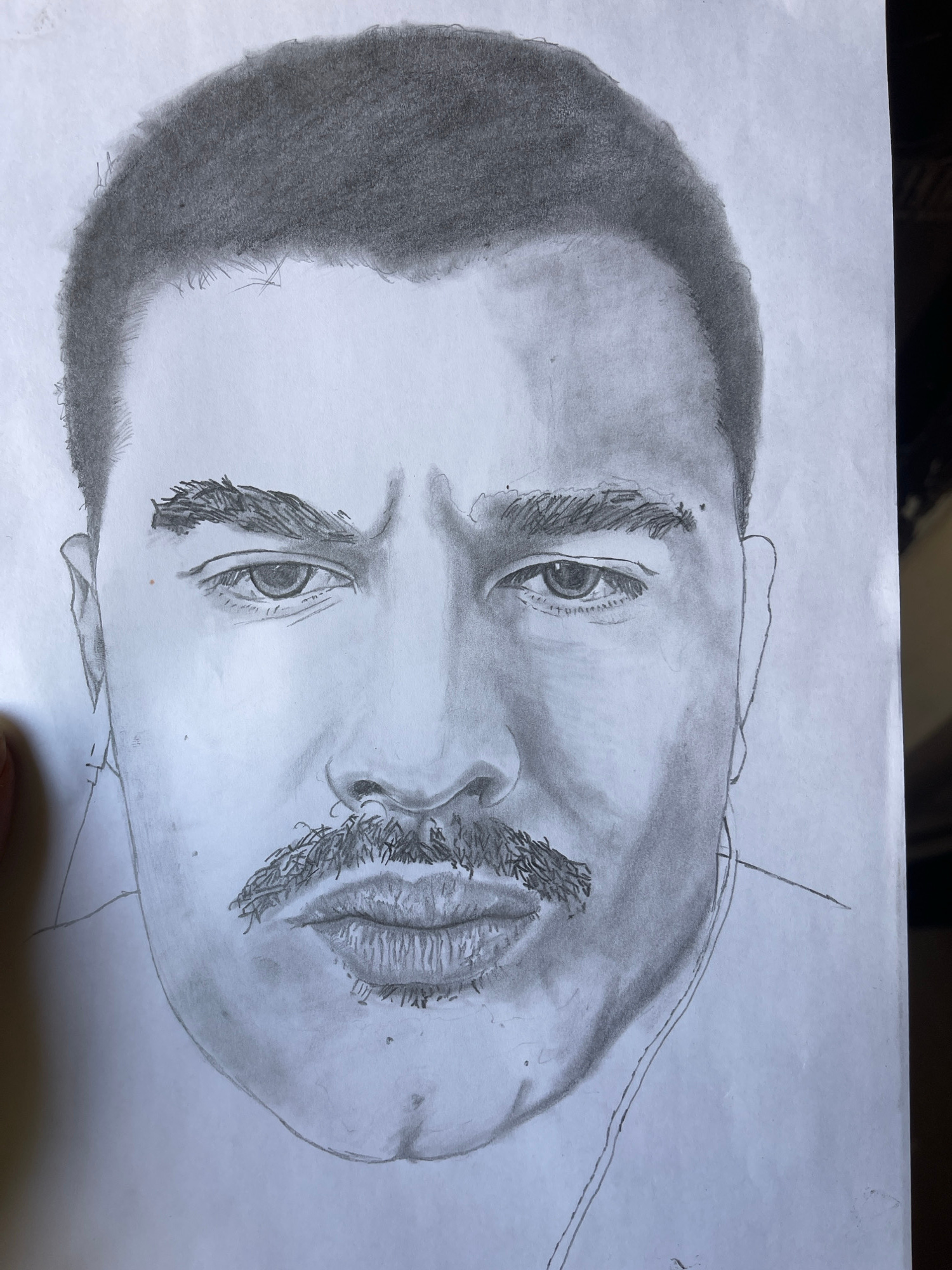 The image displays a monochrome pencil portrait on white paper, depicting a man from the head to the upper shoulders. The subject has short, dark hair, thick and furrowed eyebrows, an intense direct g…read more