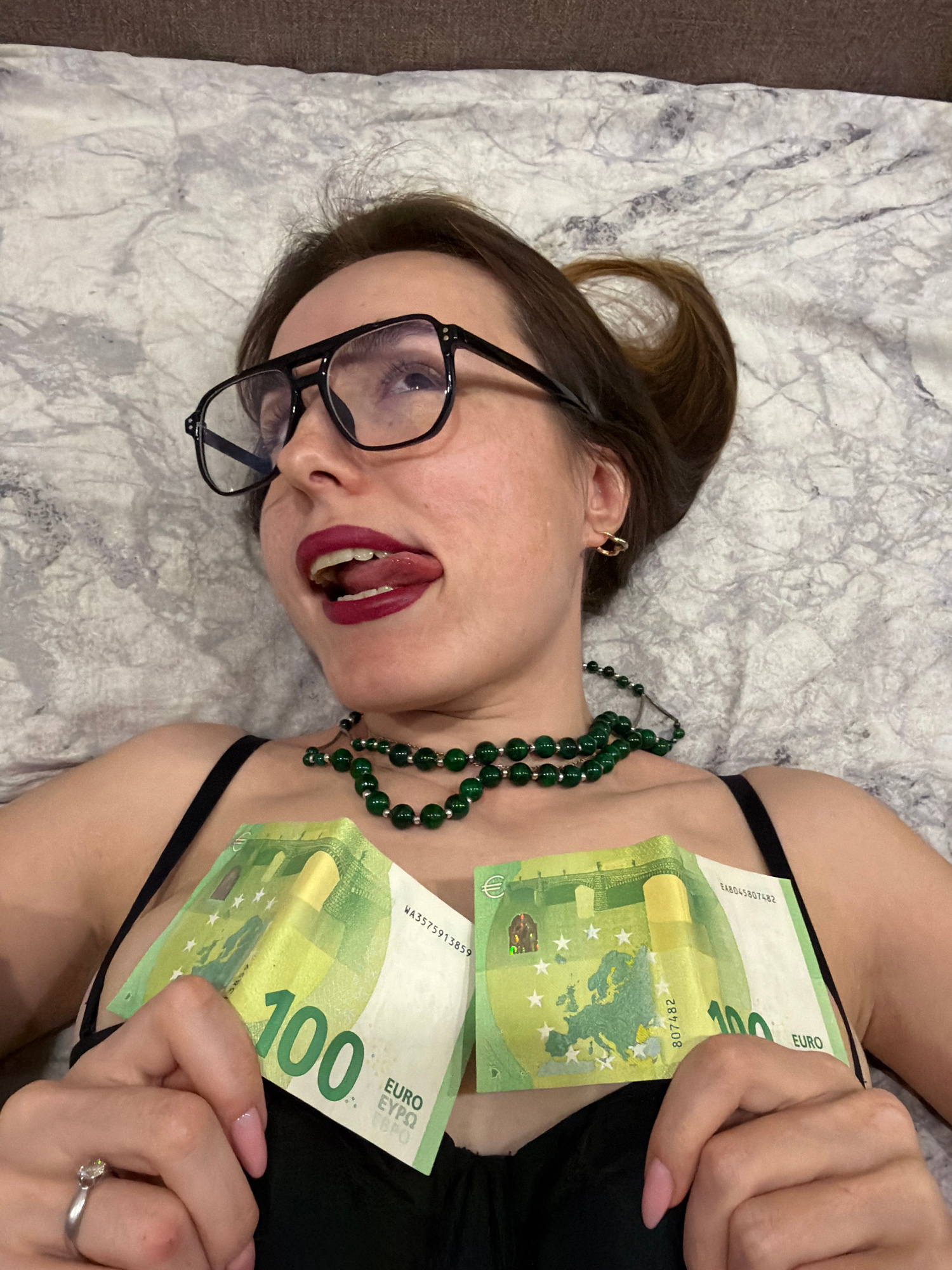 A woman is lying on a gray and white patterned surface, possibly a bed, and is holding two €100 Euro bills against her chest. She is wearing black-framed glasses, a black top, and a green beaded neckl…read more