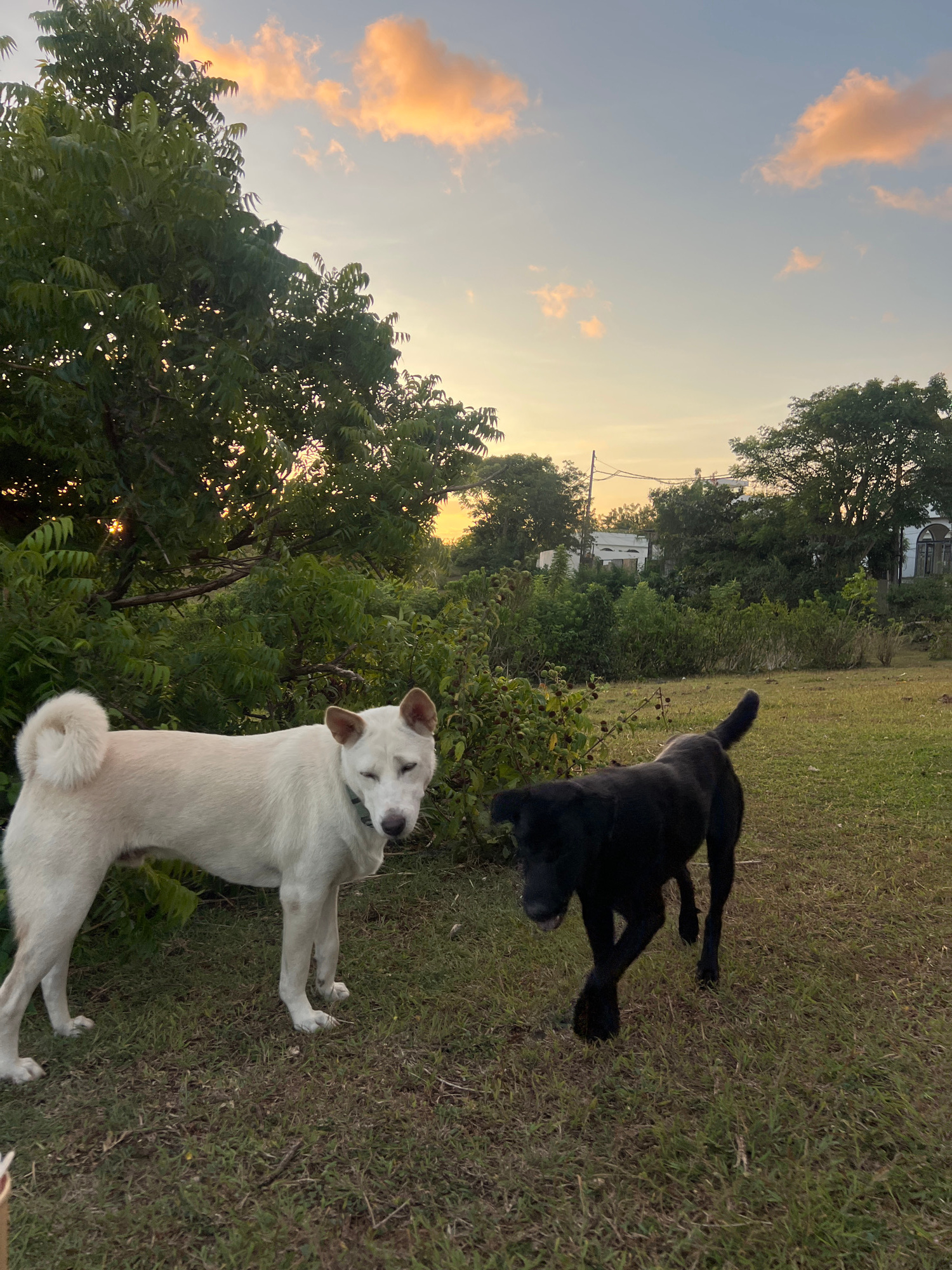 The image depicts a scene in a grassy outdoor area, possibly a yard or field. Two dogs are present: one is white and resting on the ground, while the other is black and appears to be in motion. The ba…read more