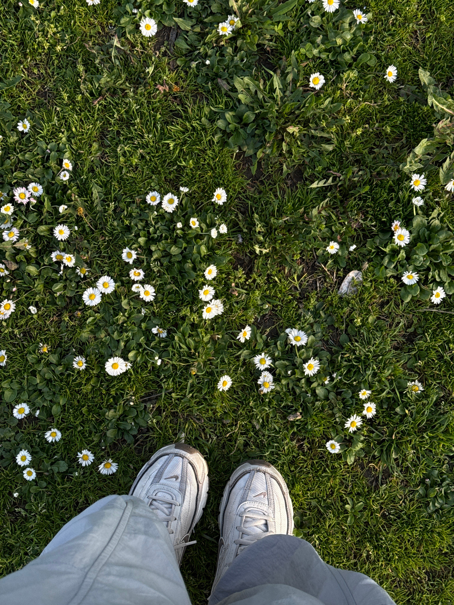 A high-angle shot captures a patch of grass interspersed with daisies, presumably in Belgrade, Serbia. Two feet in white sneakers and light grey pants are partially visible in the upper right corner.…read more