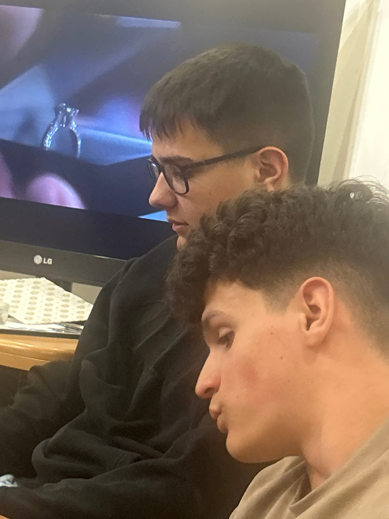 Two people are positioned in front of an LG television displaying an image of a ring. The person on the left wears glasses. The person on the right has curly hair. The location is not discernible from…read more