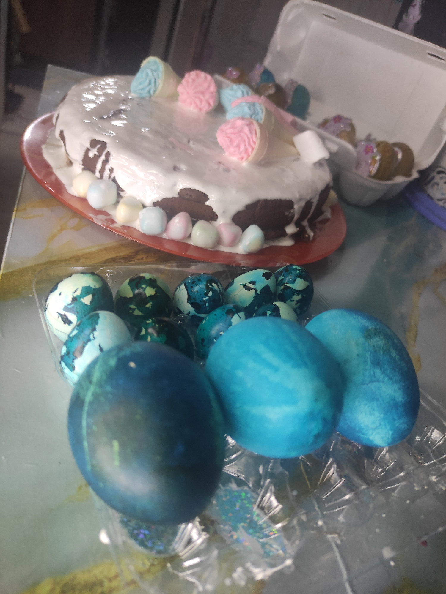 The image shows a table top scene with two main elements: dyed Easter eggs and a decorated cake. The Easter eggs are colored in various shades of blue and green. Some are stacked, while others are in…read more