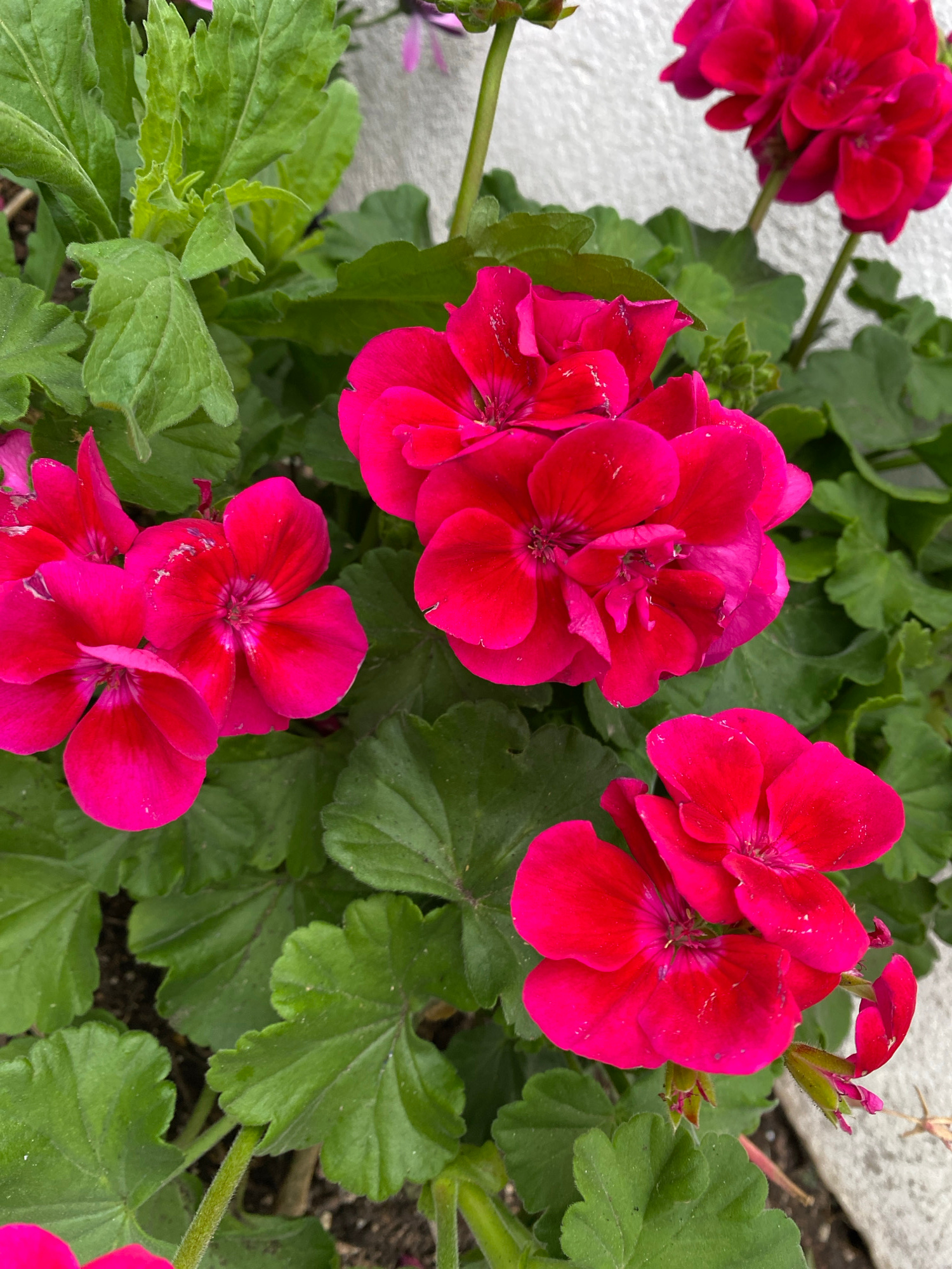 The image features a close-up view of geranium plants with bright red/pink flowers. The leaves are green with scalloped edges. The background includes a white wall. The location is not discernible fro…read more