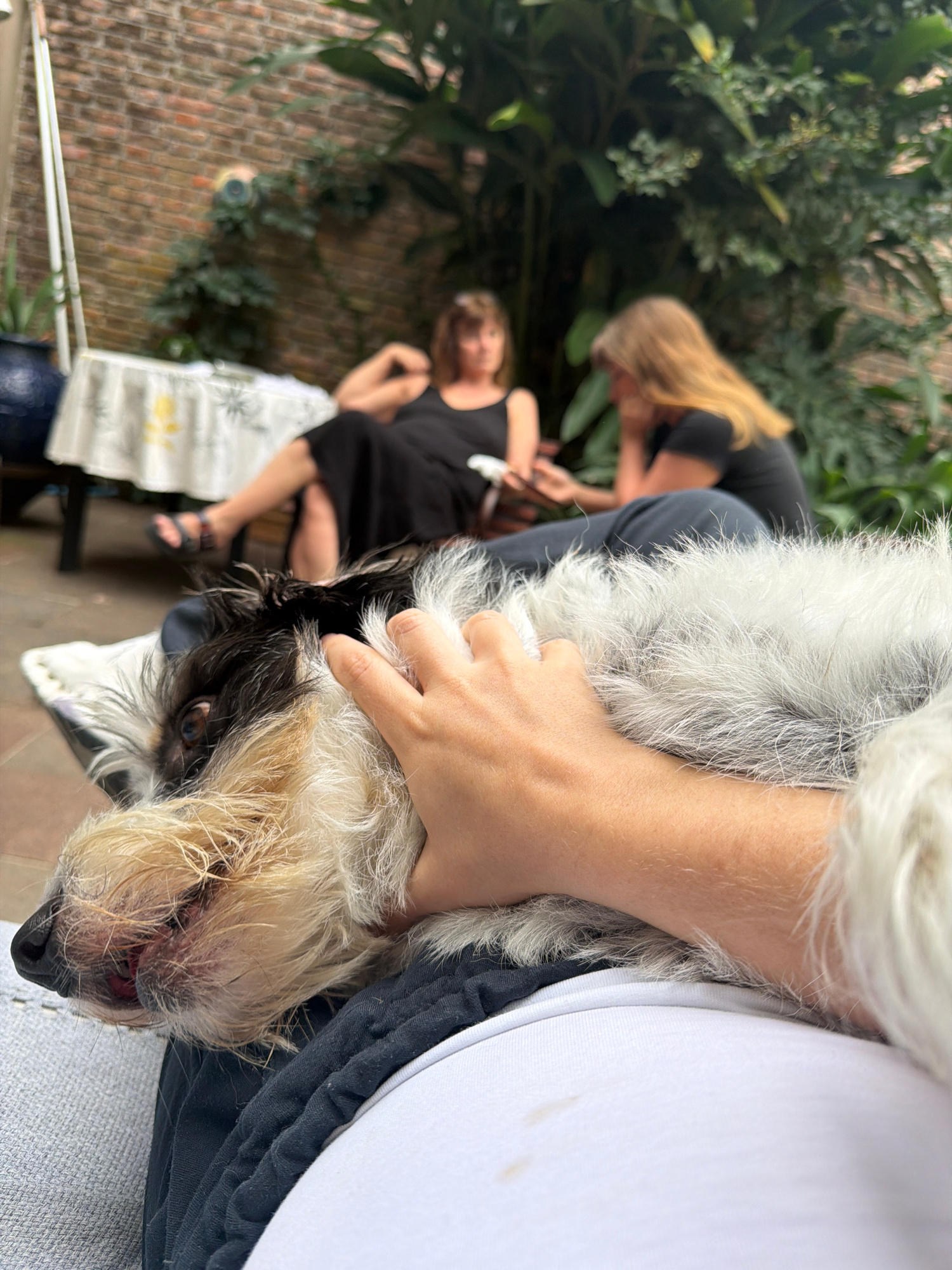 A medium shot captures a dog being held in someone's arms, positioned in the foreground. The dog has a white and black coat, and its face is near the bottom of the frame. A person's hand is visible, h…read more