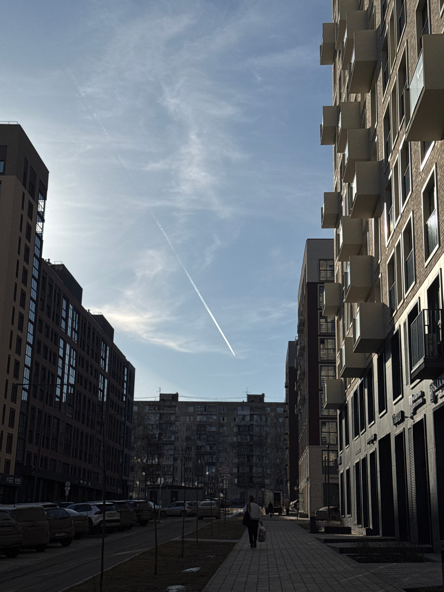The image shows a street scene in Izhevsk, Russia. The sky is light blue with wispy clouds and a contrail. Tall buildings line both sides of the street. The buildings are modern architecture with rectβ¦read more