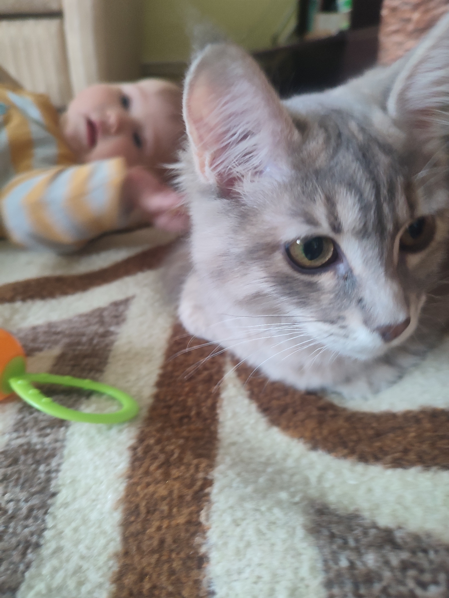 A close-up, slightly blurred image shows a gray tabby kitten with amber eyes lying on a brown and cream striped carpet. To the left of the kitten is a baby lying on its side wearing a yellow and white…read more