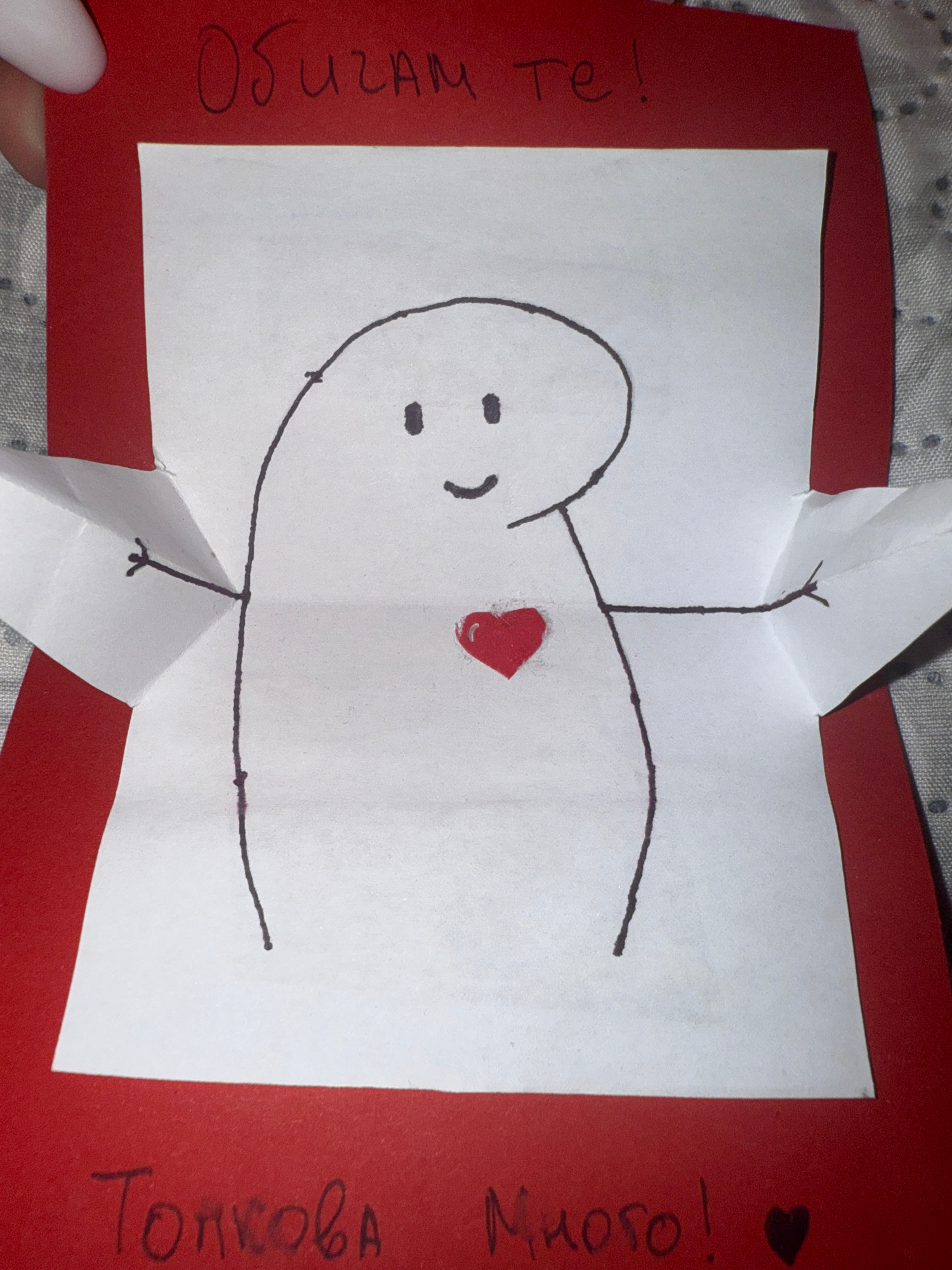The image shows a handmade pop-up greeting card, crafted from red cardstock and a white paper insert. A simplified, childlike figure is drawn in black outline on the white paper, featuring an oval hea…read more