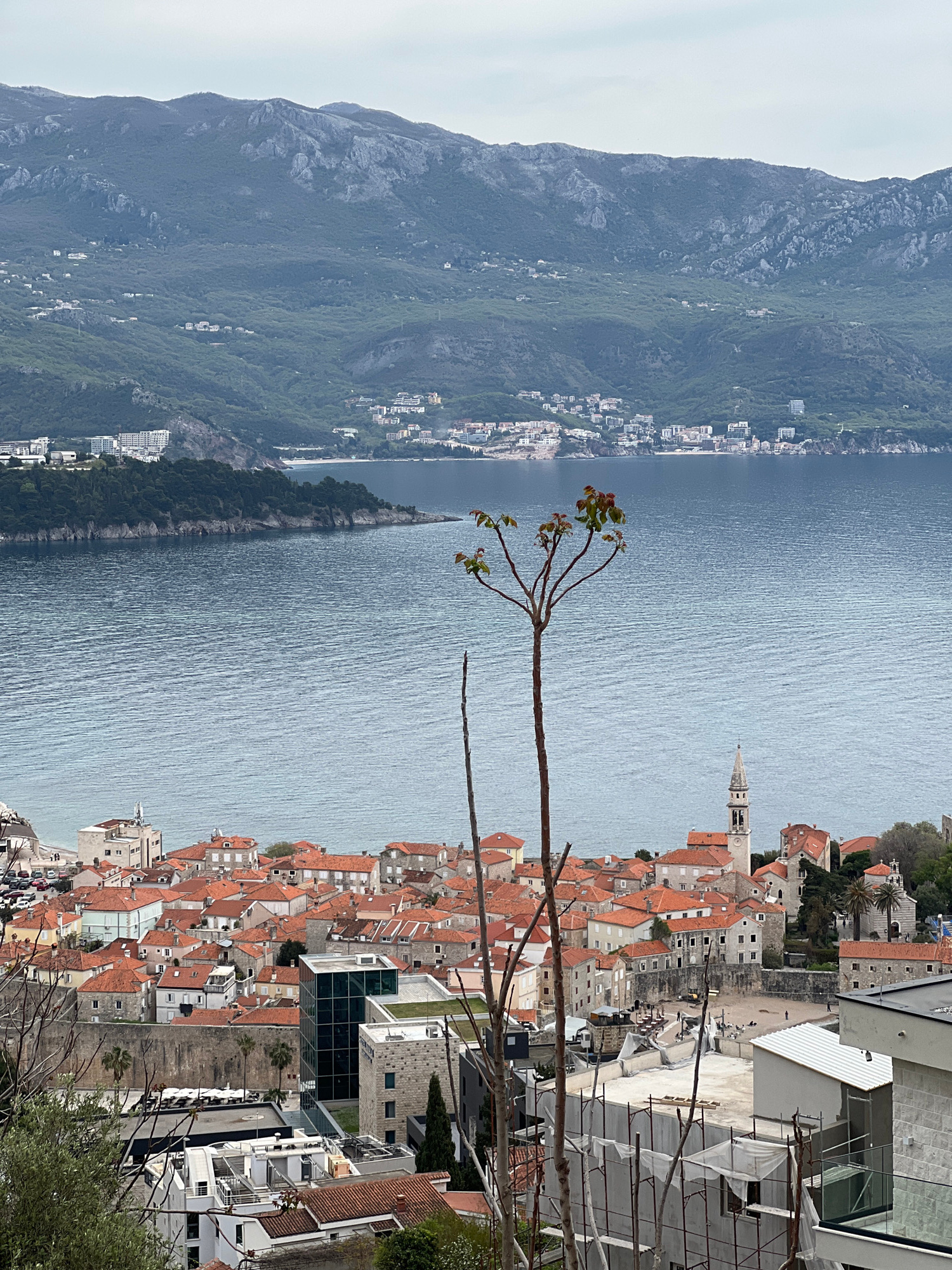 The image shows a view of the Adriatic coast, including the old town of Budva, Montenegro, a small island with vegetation connected by a narrow isthmus, and a mountain range in the distance. The persp…read more