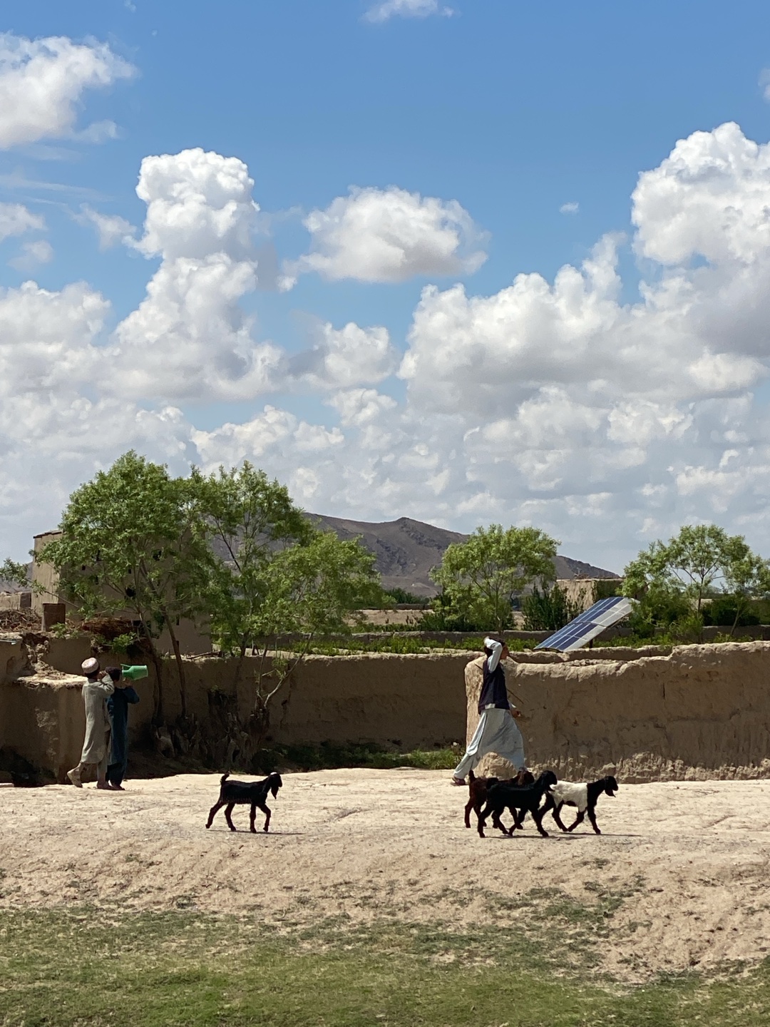 The image depicts a rural scene in Mandisar, Afghanistan. In the foreground, a herd of goats is being tended by a man dressed in traditional clothing, including a white turban, a dark vest, and light-…read more