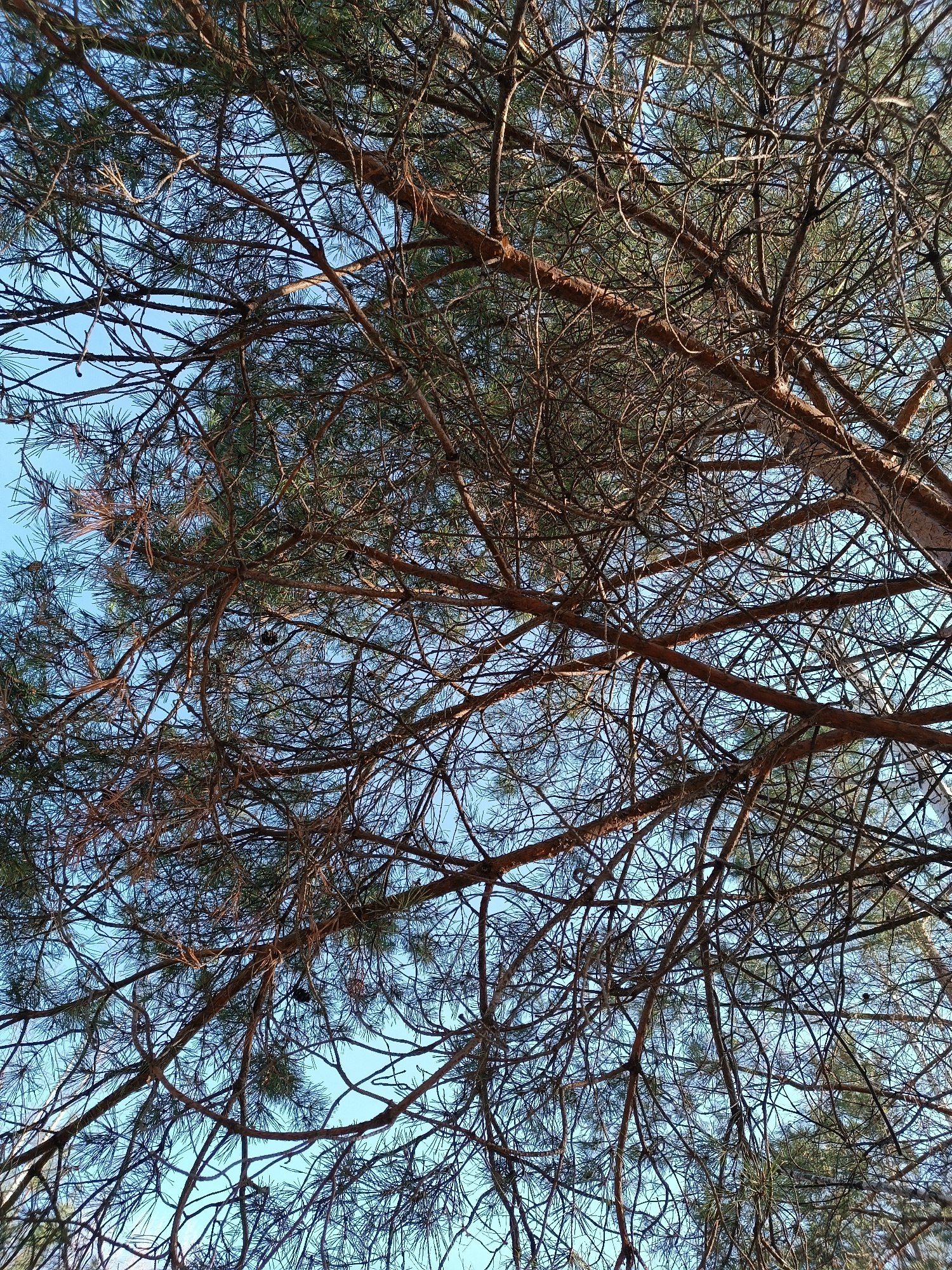 The image depicts a view looking up into the branches of a coniferous tree, possibly a pine, against a clear blue sky. The branches are bare in some areas, while others are covered with dense green ne…read more