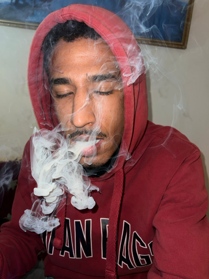 A close-up image depicts an adult male, appearing to be of North African or Middle Eastern descent, exhaling a significant volume of white smoke from his mouth. His eyes are closed, and his mouth is s…read more
