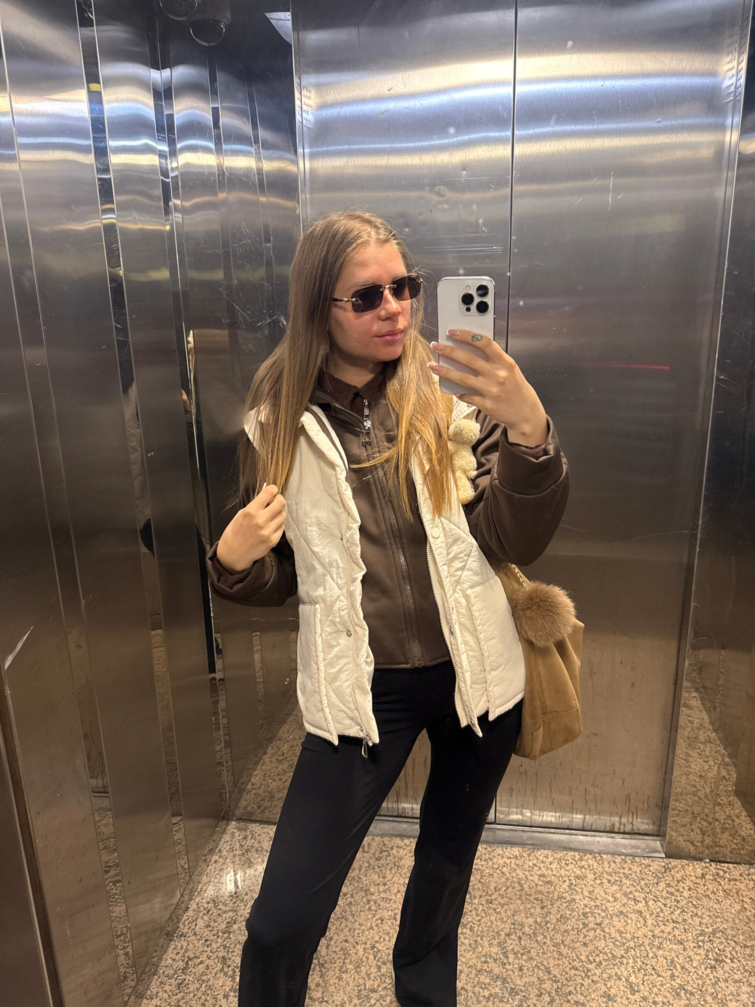 A female is taking a selfie in an elevator. She is wearing a brown jacket with a white vest, black pants, and sunglasses. She is holding a white smartphone in her right hand. She has long brown hair.…read more