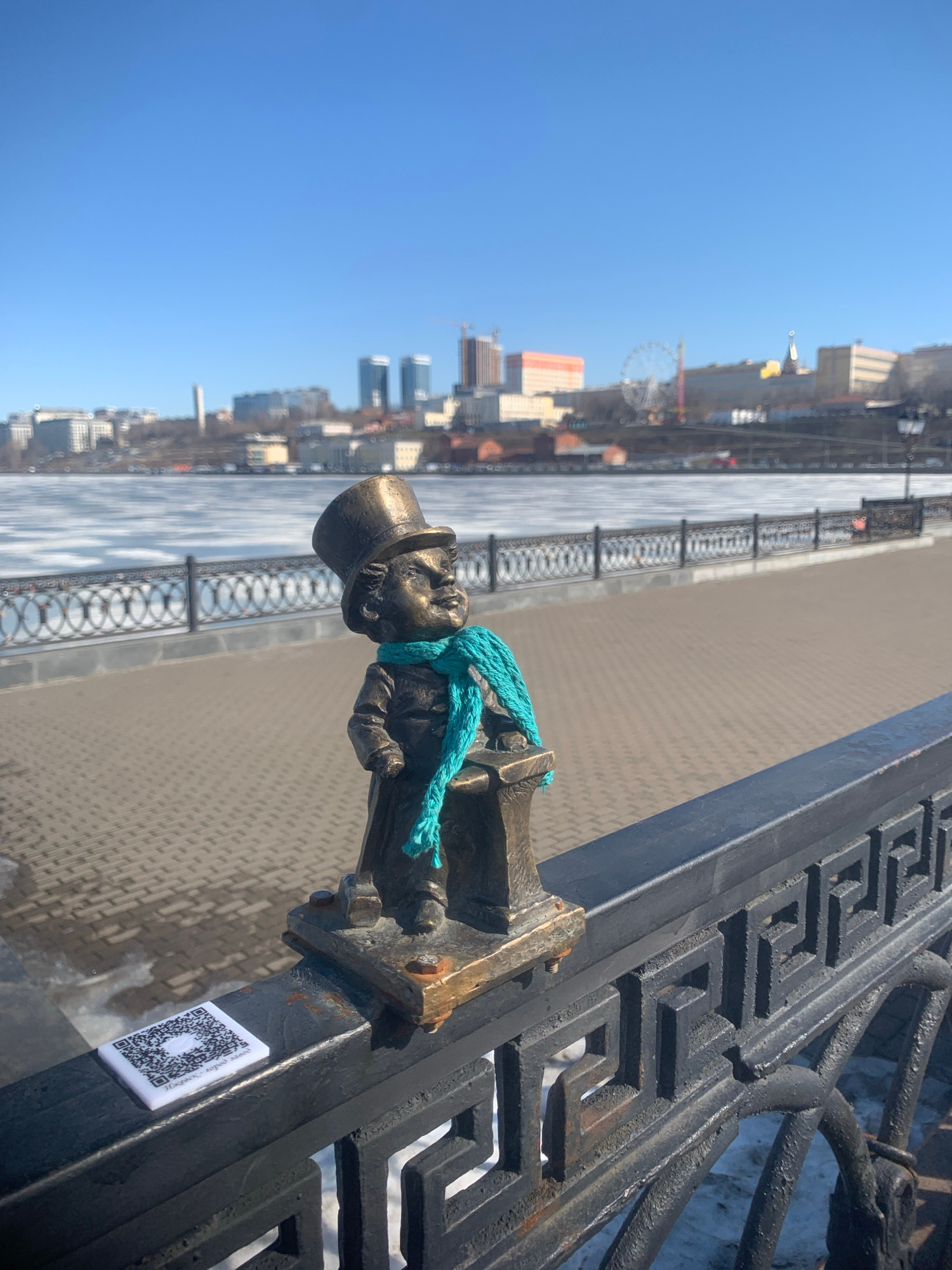 The photograph presents a close-up, slightly angled view of a bronze statue of a small man in a top hat and a turquoise scarf. The statue is affixed to a black metal railing. In the background, out of…read more