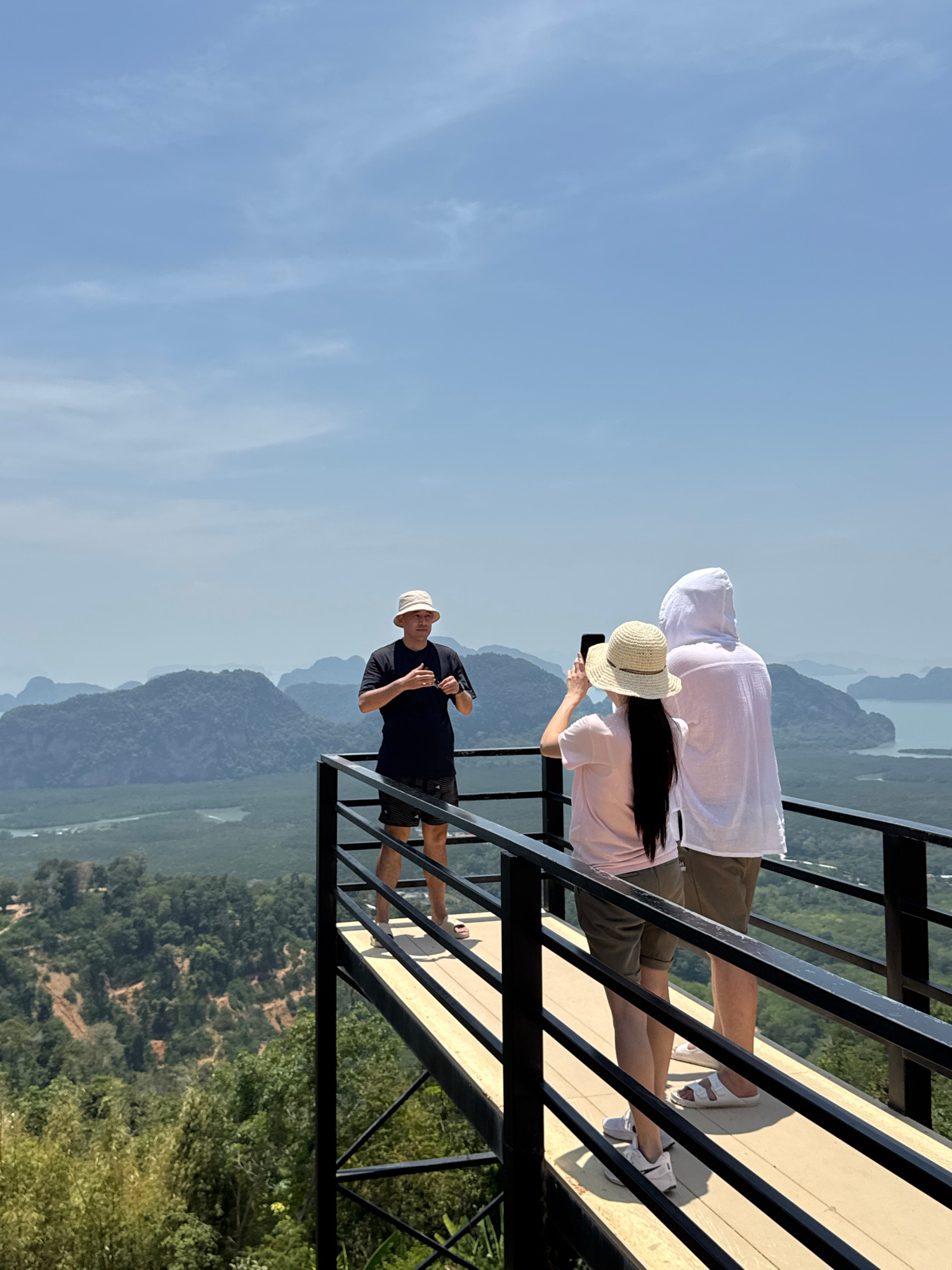 The image shows a group of three people standing on a lookout platform in Ban Khlong Khian, Thailand. The platform has a black metal railing and a light-colored wooden floor. The view from the platfor…read more