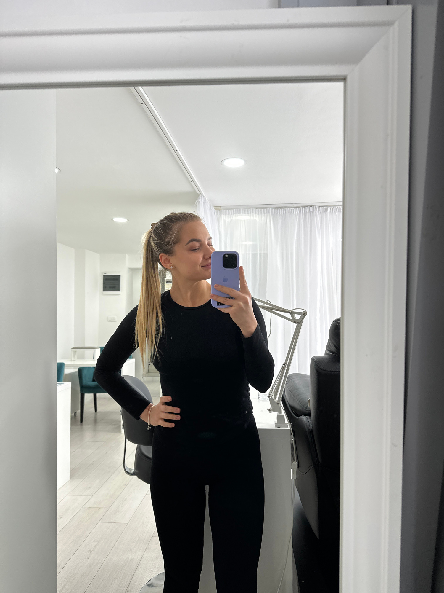 A woman stands in front of a large, rectangular, white-framed mirror taking a selfie with a lavender-colored smartphone. She is wearing a black, long-sleeved top and black leggings. Her blond hair is…read more