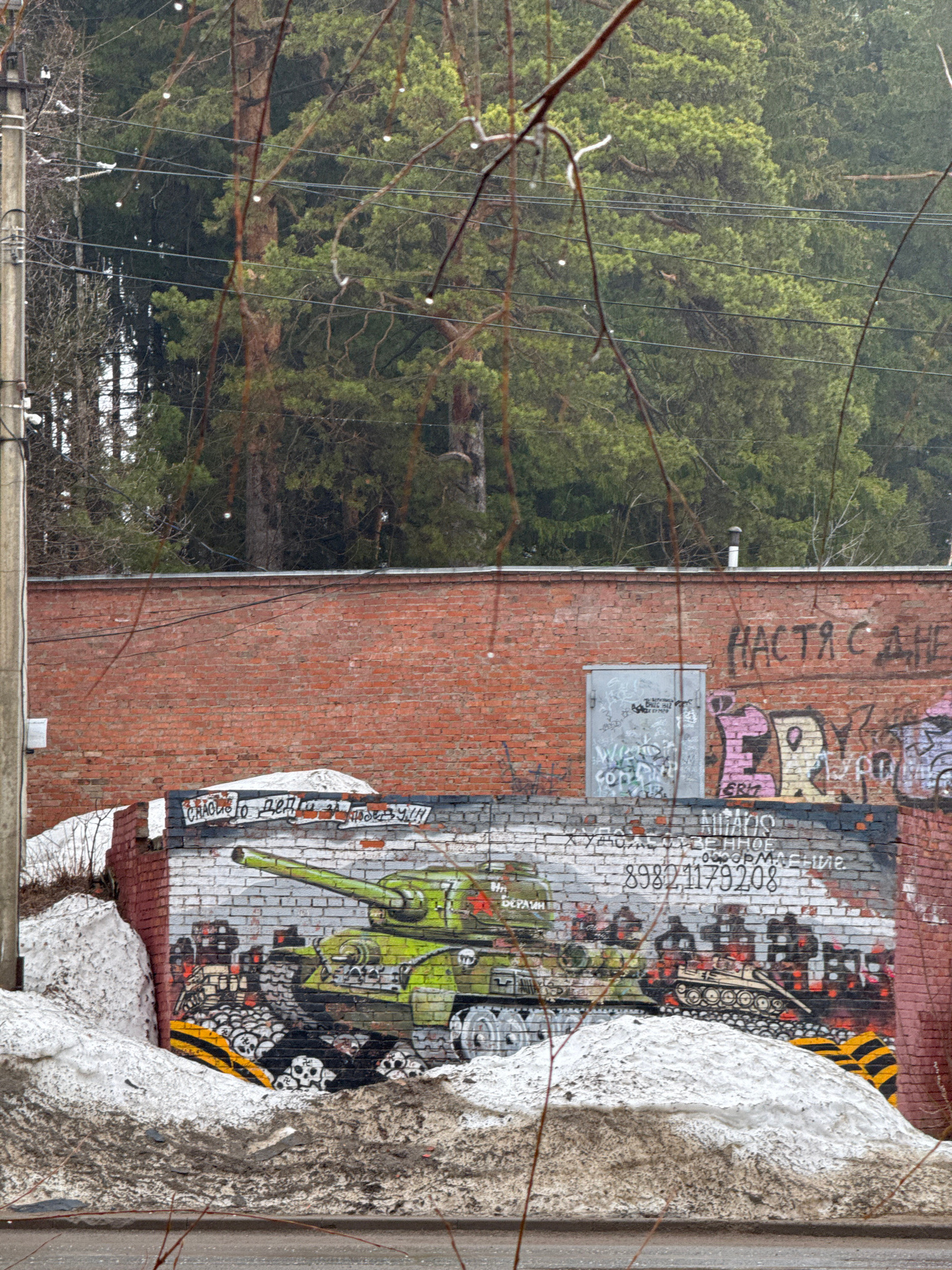 The image shows a brick building with graffiti in Votkinsk, Russia. The graffiti includes Russian script, a green tank, and the phone number 89821179208. The top of the wall is covered in old and rece…read more