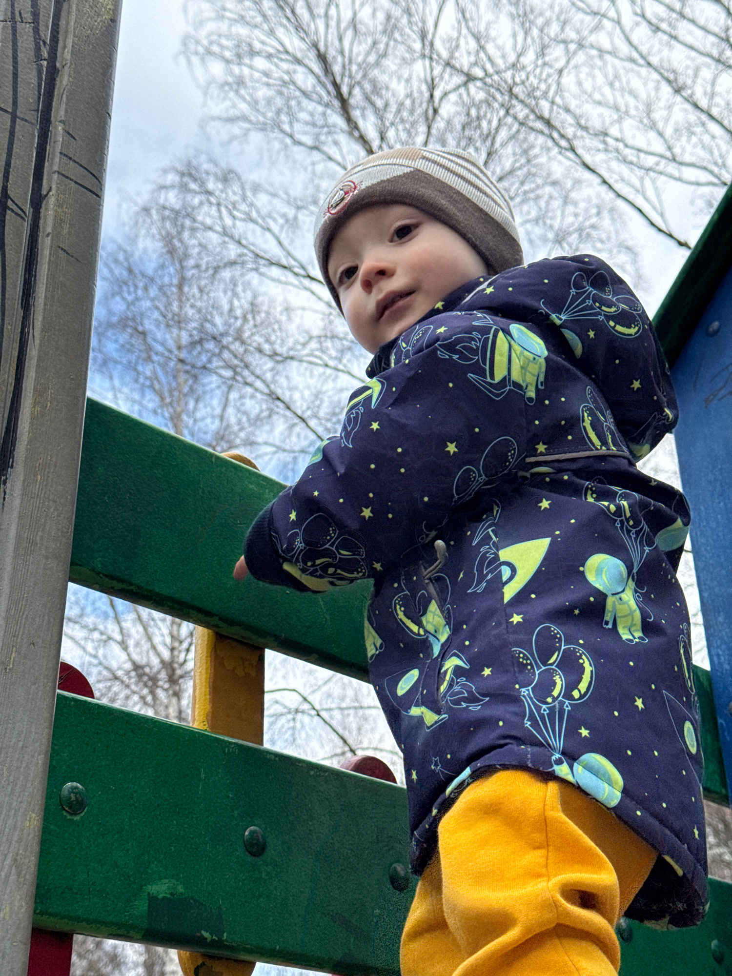 The image presents a low-angle perspective looking up at a young child from below a playground structure. The child, appearing to be a toddler, is positioned above the camera, peering down. They are d…read more