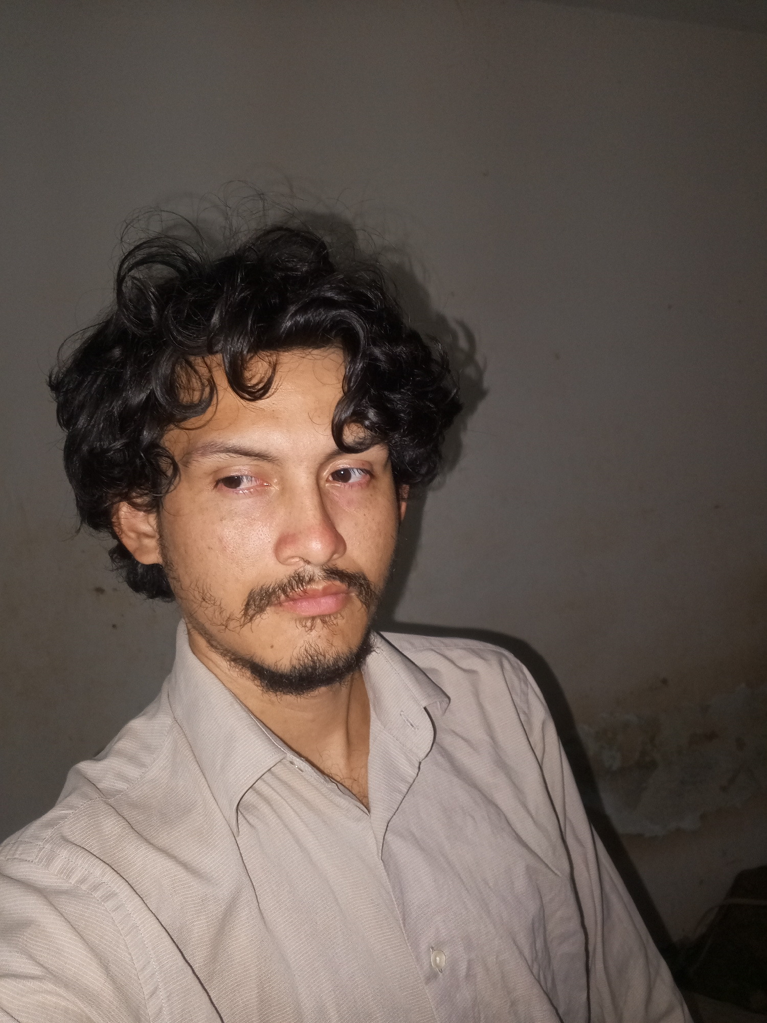A medium close-up shot depicts a man with dark, curly hair and a patchy beard and mustache. He is wearing a light-colored button-down shirt. The background is a dimly lit, neutral-toned wall. The loca…read more