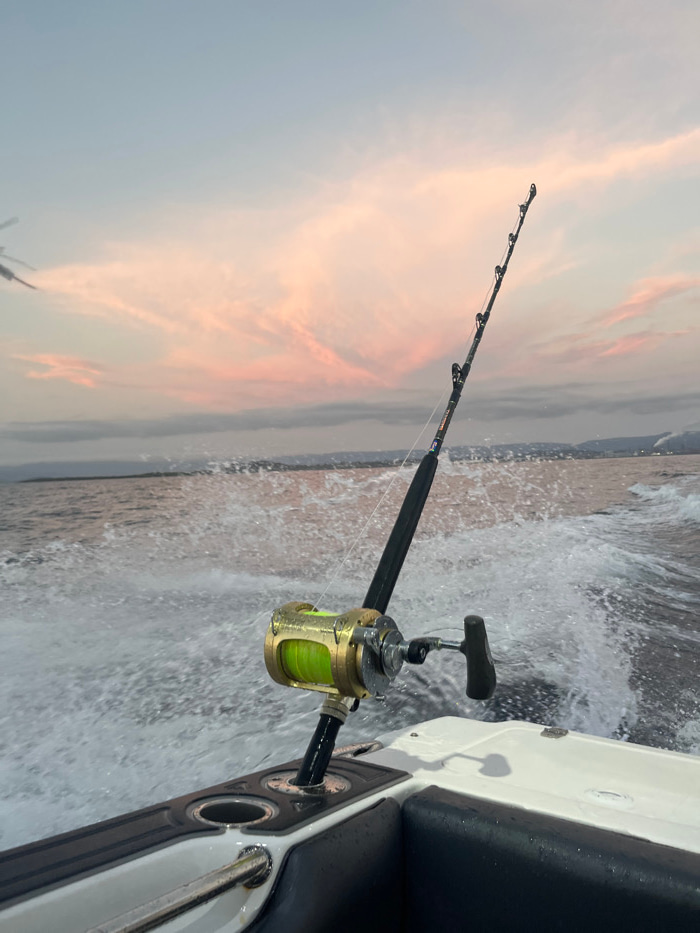 A fishing rod, secured to the stern of a boat, juts out against a dusky sky with hints of pink. A large, gold-colored reel is attached to the rod. The boat is moving, evidenced by the water splashing…read more