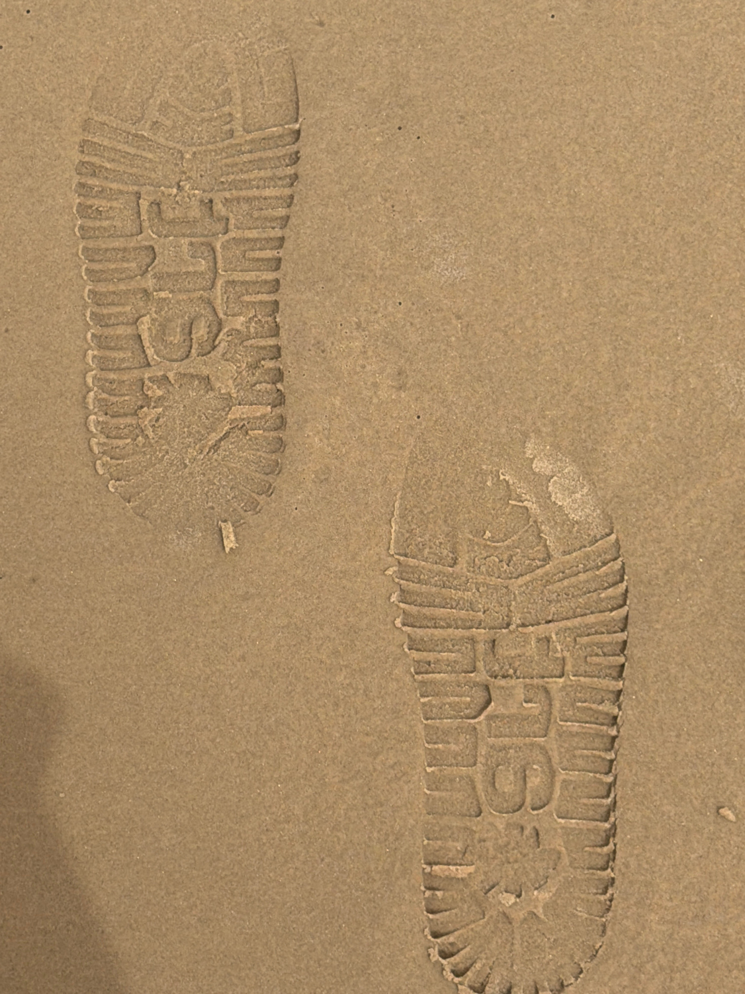Two shoe prints are visible in a sandy or dusty substrate. The shoe tread appears to have a distinctive pattern with prominent lettering or characters embedded within it. The surrounding environment a…read more