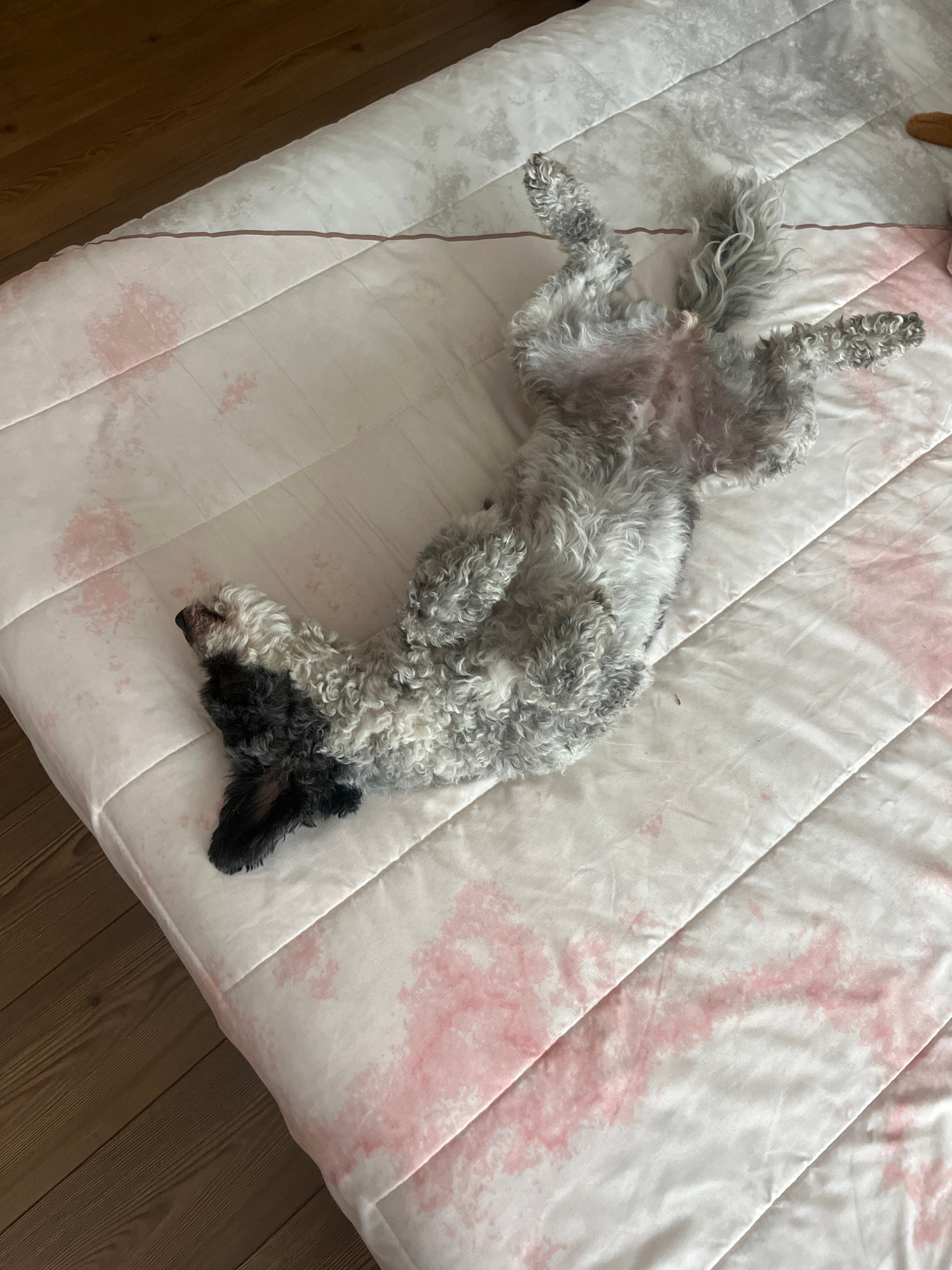 A medium-sized gray and white dog lies on its back on a white and pink patterned comforter. The dog's head, which is mostly black, is at the lower right of the frame. The dog's paws are in the air. Th…read more