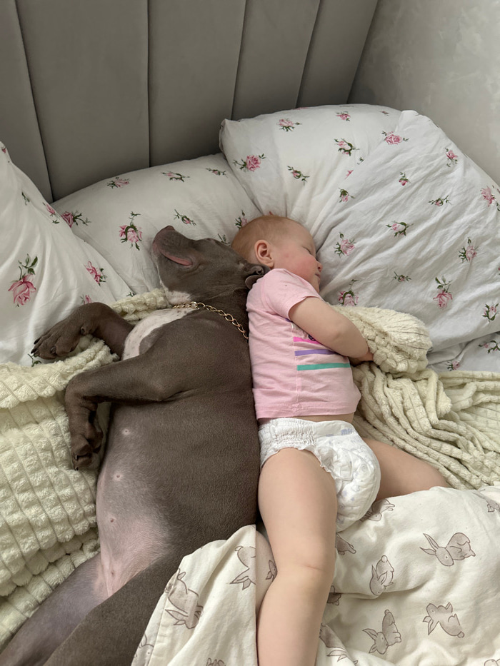 An overhead view depicts a grey-coated American Pit Bull Terrier type dog and an infant sleeping side-by-side on a bed in Pervomaysky, Russia. The dog, wearing a gold-colored chain collar, lies primar…read more