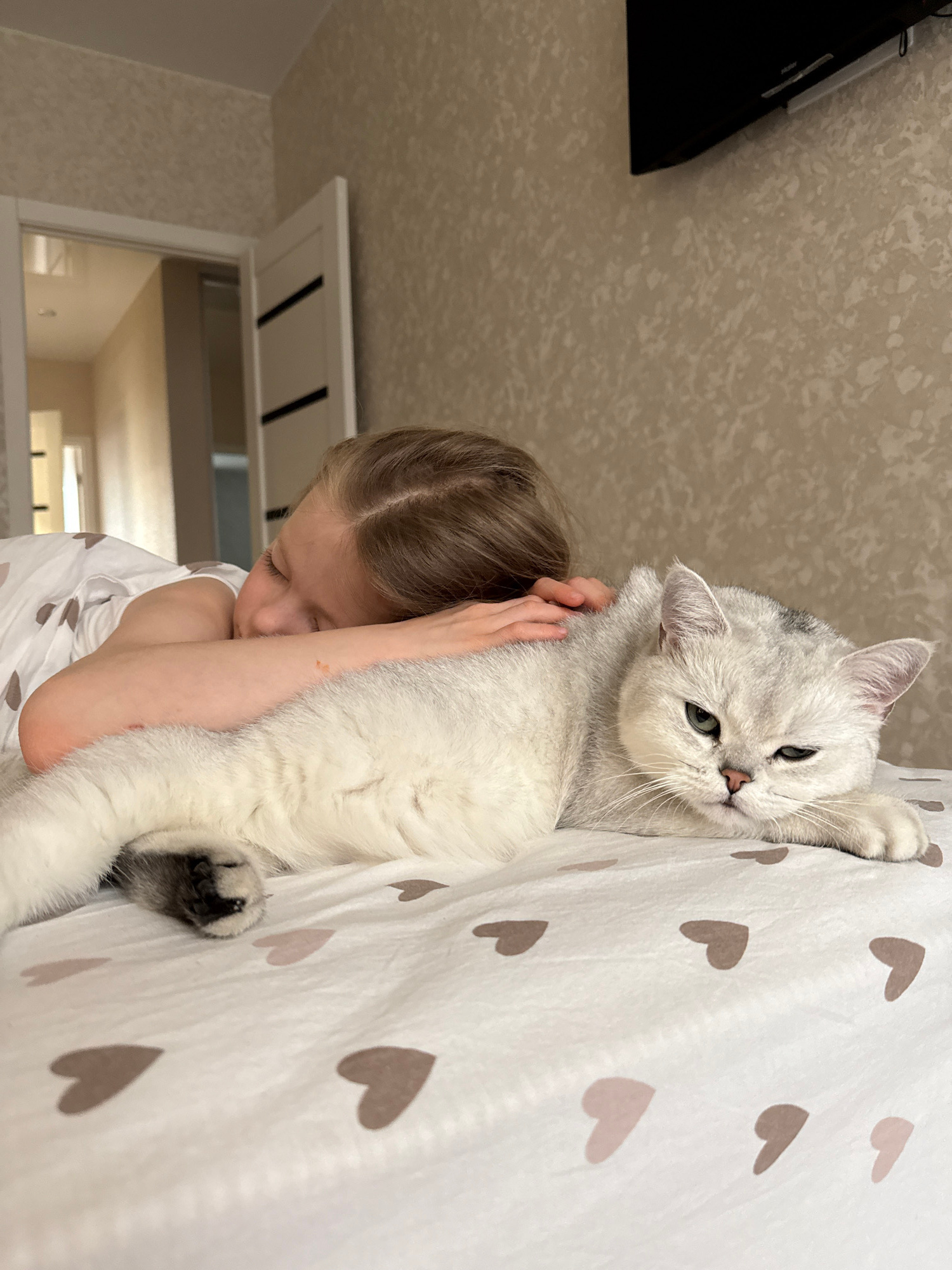 A young, light-skinned girl with blonde hair braided into pigtails is holding a large, white and gray cat against a bedspread with brown heart patterns. The cat is facing the camera. The girl's face i…read more