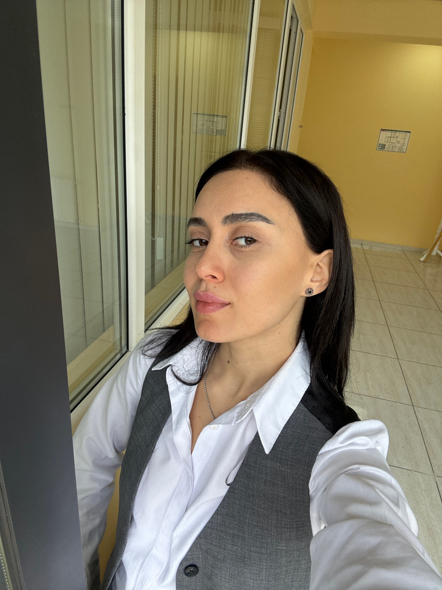 A woman with dark hair is seen in a close-up shot, wearing a white shirt and a gray vest. She is positioned near a window with blinds. The location is likely Tbilisi, Georgia. The background includes…read more